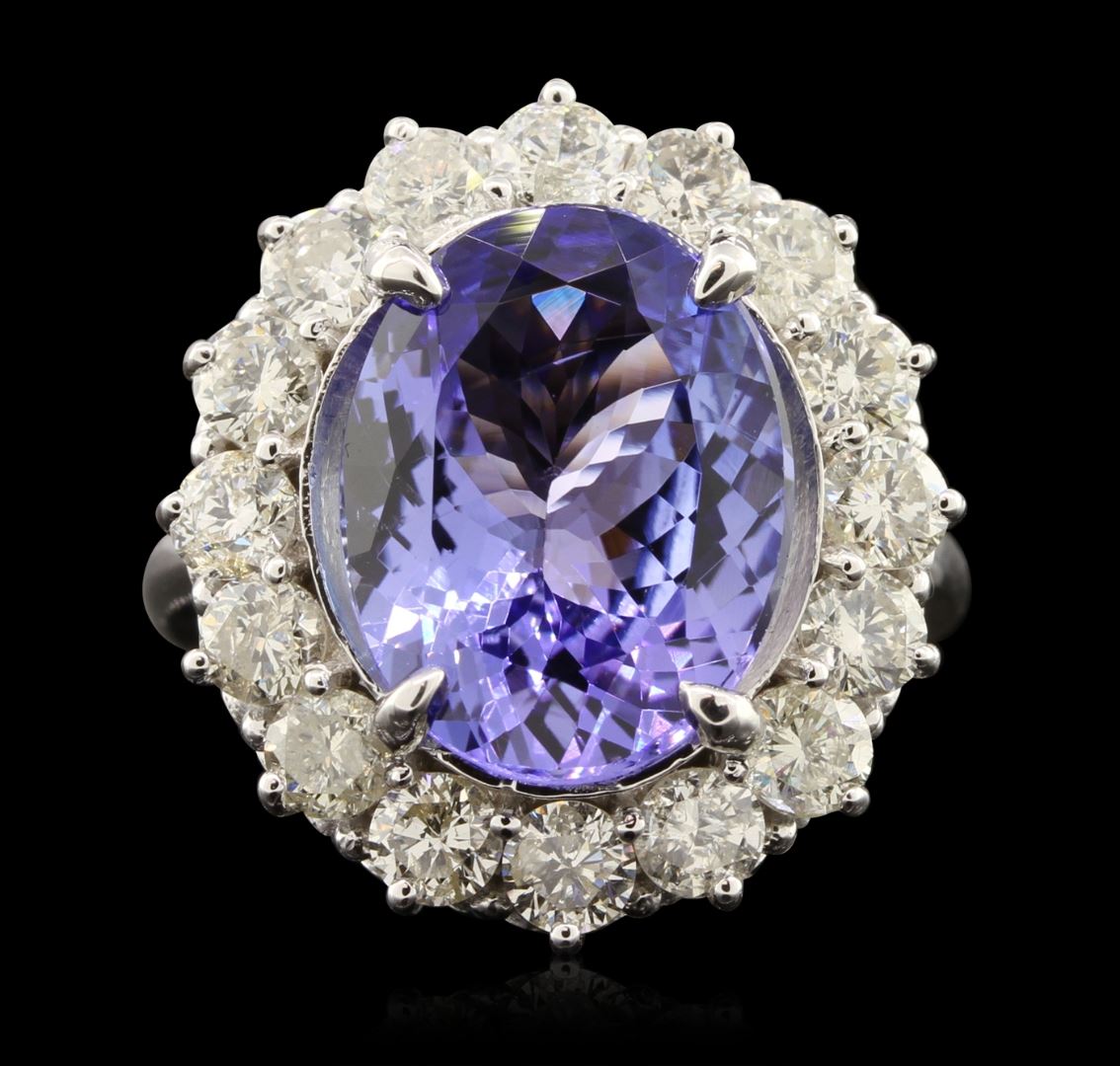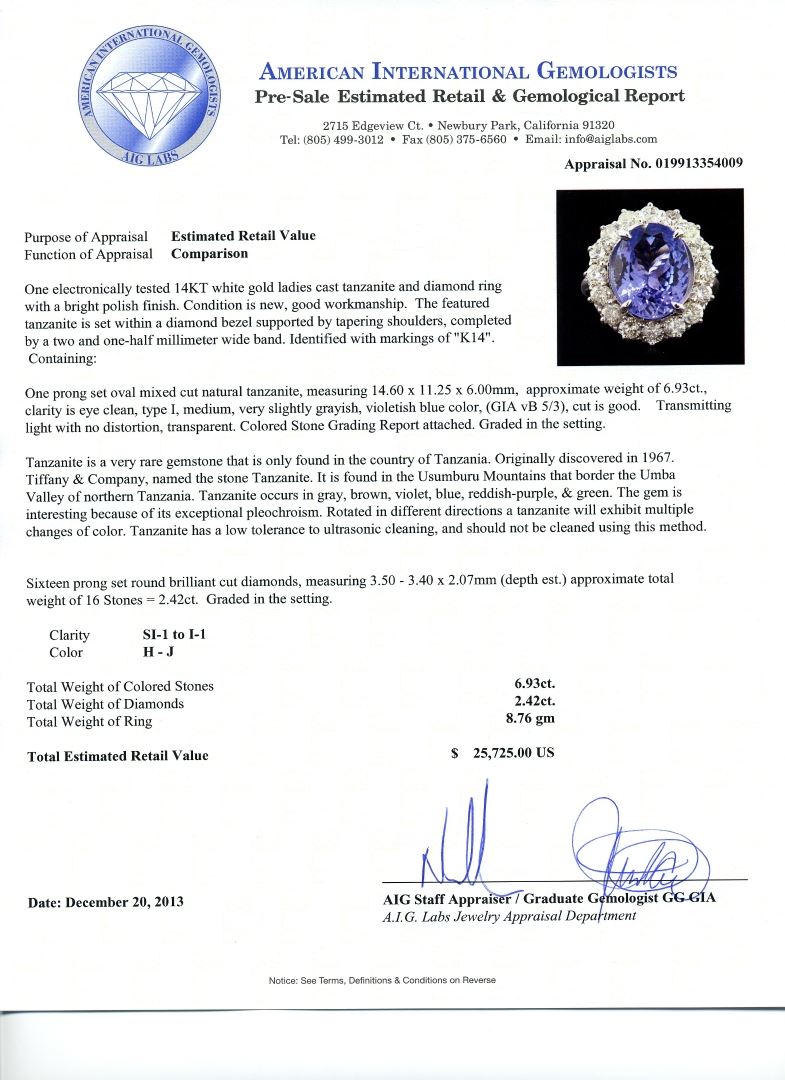 14KT white gold 6.93ct Tanzanite and Diamond Ring A6612. One electronically tested 14KT white gold ladies cast tanzanite and diamond ring with a bright polish finish. The featured tanzanite is set within a diamond bezel supported by tapering shoulders, completed by a two and one-half millimeter wide band. Identified with markings of "K14". Condition is new, good workmanship. Containing: One prong set oval mixed cut natural tanzanite, measuring 14.60 x 11.25 x 6.00mm, approximate weight of 6.93ct., clarity is eye clean, type I, medium, very slightly grayish, violetish blue color, (GIA vB 5/3), cut is good. Transmitting light with no distortion, transparent. Colored Stone Grading Report attached. Graded in the setting.Tanzanite is a very rare gemstone that is only found in the country of Tanzania. Originally discovered in 1967. Tiffany & Company, named the stone Tanzanite. It is found in the Usumburu Mountains that border the Umba Valley of northern Tanzania. Tanzanite occurs in gray, brown, violet, blue, reddish-purple, & green. The gem is interesting because of its exceptional pleochroism. Rotated in different directions a tanzanite will exhibit multiple changes of color. Tanzanite has a low tolerance to ultrasonic cleaning, and should not be cleaned using this method.Sixteen prong set round brilliant cut diamonds, measuring 3.50 - 3.40 x 2.07mm (depth est.) approximate. Total Weight of 16 Stones = 2.42ct. Graded in the setting. Clarity: SI-1 to I-1. Color: H - J. Total Weight of Colored Stones 6.93ct. Total Weight of Diamonds 2.42ct. AIG Appraised at $25,725.00.