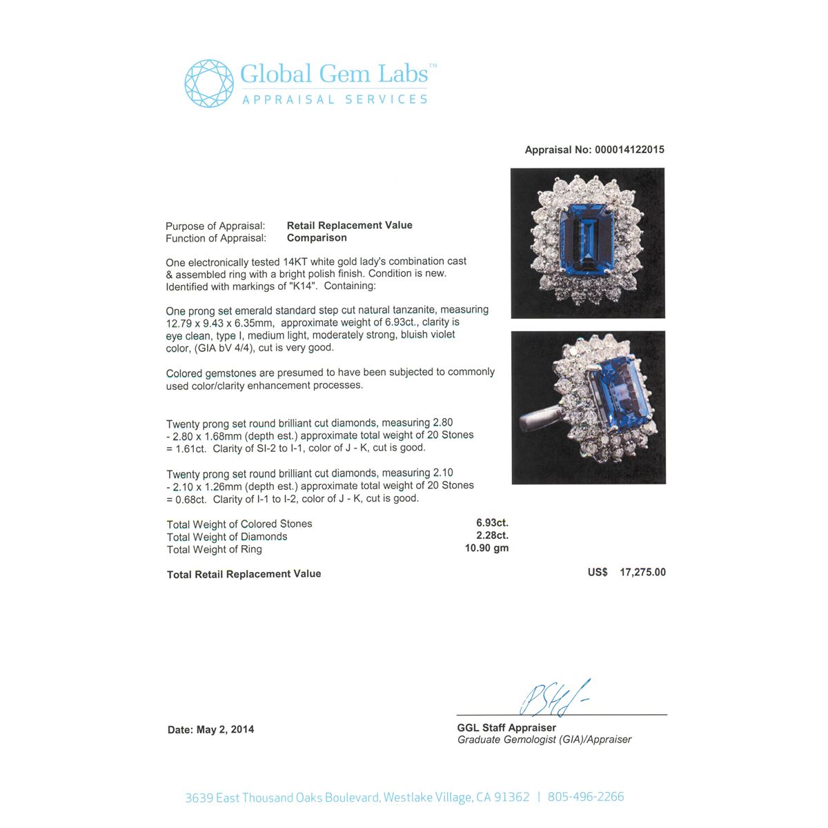 One electronically tested 14KT white gold Ladies combination cast & assembled ring with a bright polish finish. Condition is new. Identified with markings of "K14". Containing: One prong set emerald standard step cut natural tanzanite, measuring 12.79 x 9.43 x 6.35mm, approximate weight of 6.93ct., clarity is eye clean, type I, medium light, moderately strong, bluish violet color, (GIA bV 4/4), cut is very good. Colored gemstones are presumed to have been subjected to commonly used color/clarity enhancement processes. Twenty prong set round brilliant cut diamonds, measuring 2.80 - 2.80 x 1.68mm (depth est.) approximate. Total Weight of 20 Stones = 1.61ct. Clarity: SI-2 to I-1. Color: J - K, Cut is Good. Twenty prong set round brilliant cut diamonds, measuring 2.10 - 2.10 x 1.26mm (depth est.) approximate. Total Weight of 20 Stones = 0.68ct. Clarity: I-1 to I-2. Color: J - K, Cut is Good. Total Weight of Colored Stones 6.93ct. Total Weight of Diamonds 2.28ct. Total Weight of Ring 10.90 grams. GGL Appraised at $17,275.00.