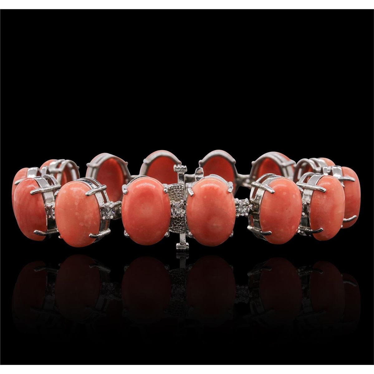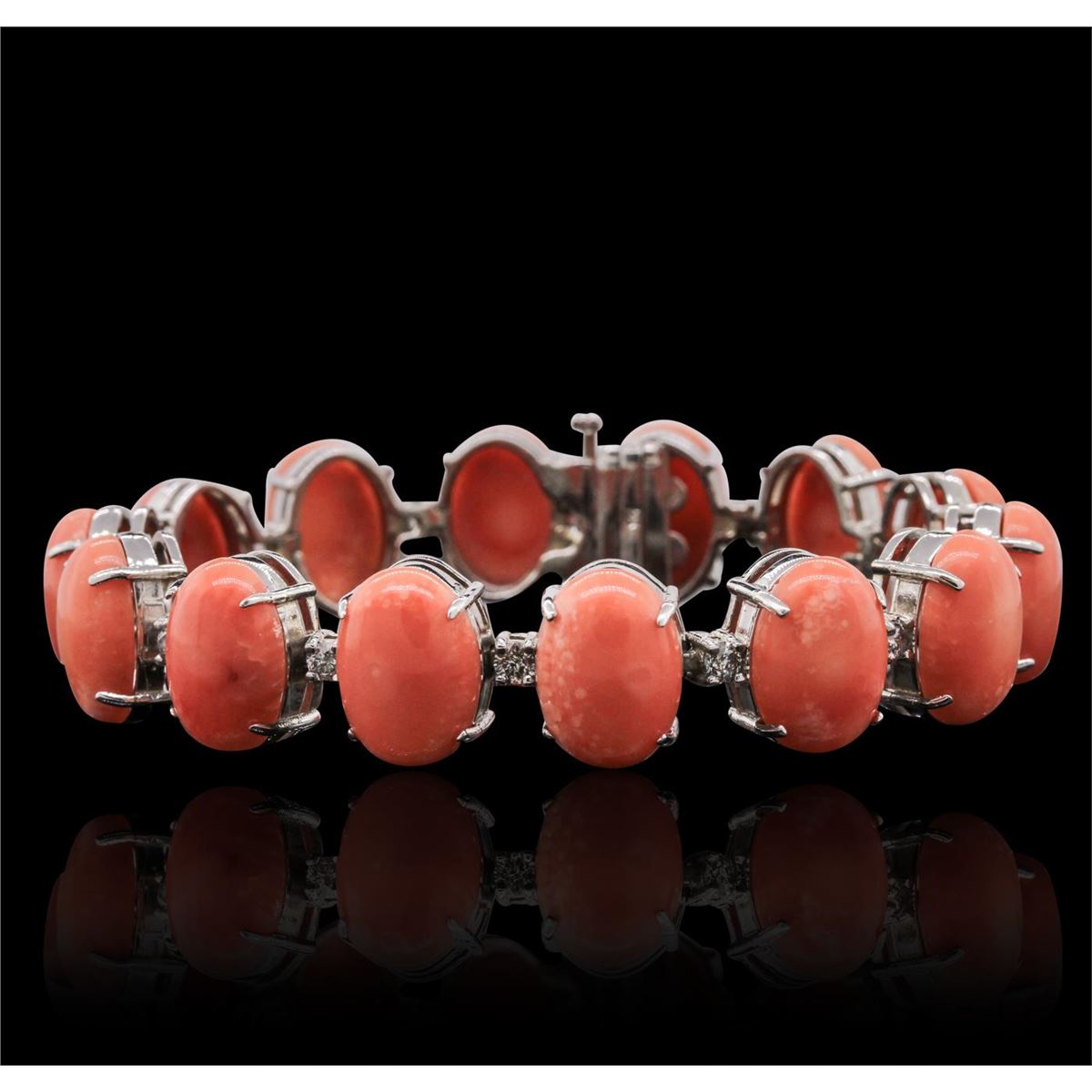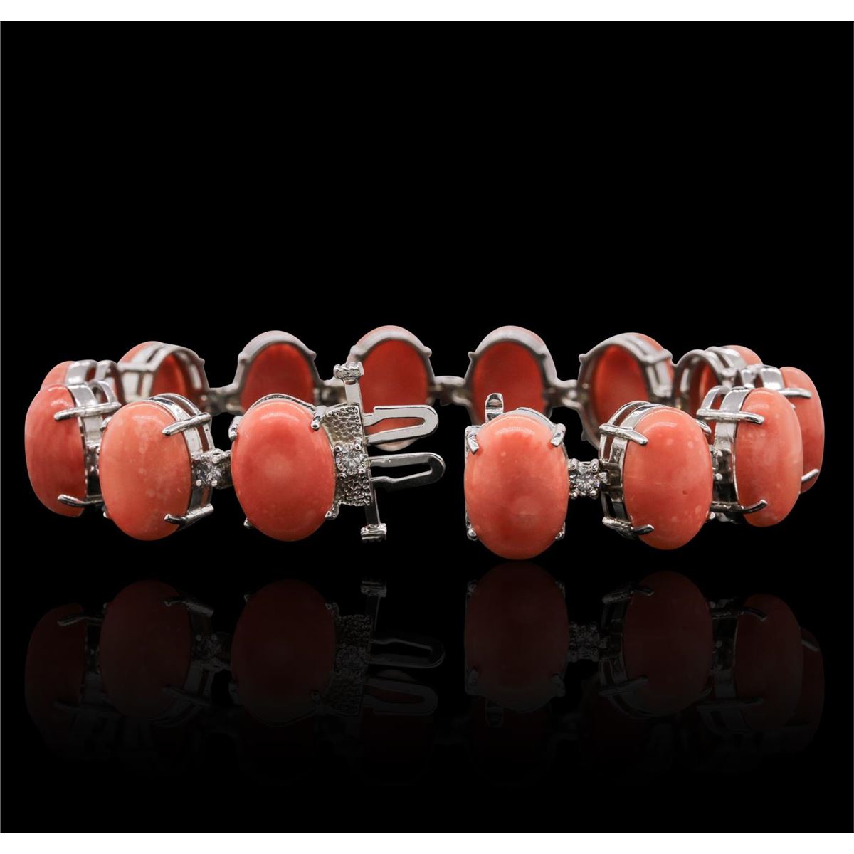 One electronically tested 14KT white gold ladies cast & assembled coral and diamond bracelet. Condition is new, good workmanship. Seven and one-quarter inch length bracelet features a flexible coral and diamond ribbon, terminating in a concealed clasp with safety bar. Bright polish finish. Identified with markings of "14K". Containing: Fourteen prong set oval cabochon cut natural salmon corals, measuring 14.00 x 10.00 x 4.40mm, 5%. bulge factor, approximate. Total Weight of 64.92ct., clarity is severely included, medium dark, very slightly brownish, reddish orange color, (GIA rO 6/3), cut is good. Transmitting light very diffusely, opaque. Naturally occurring internal & external characteristics are present. Measurements & the color grade are an average for the group. Graded in the setting. Salmon Coral is formed undersea by microscopic animals called coral polyps. These tiny, creatures form minute, hard shells. As a colony grows, it takes on complex branching, tree-like forms which allows the maximum number of polyps to be fed by the nutrients in the water. It grows about one quarter inch per year. This color of coral is commonly treated to improve or change the color and stability. Evidence that may confirm this is typically lacking. Fourteen prong set round brilliant cut diamonds, measuring 3.00 - 3.00 x 1.80mm (depth est.) approximate. Total Weight of 14 Stones = 1.48ct. Graded in the setting. Clarity: I-1 to I-2. Color: G - I. Total Weight of Colored Stones 64.92ct. Total Weight of Diamonds 1.48ct. Total Weight of Bracelet 38.57 grams. AIG Appraised at $26,845.00.
