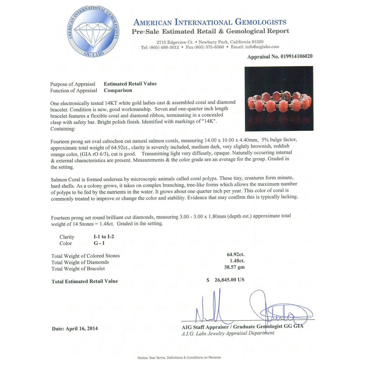 One electronically tested 14KT white gold ladies cast & assembled coral and diamond bracelet. Condition is new, good workmanship. Seven and one-quarter inch length bracelet features a flexible coral and diamond ribbon, terminating in a concealed clasp with safety bar. Bright polish finish. Identified with markings of "14K". Containing: Fourteen prong set oval cabochon cut natural salmon corals, measuring 14.00 x 10.00 x 4.40mm, 5%. bulge factor, approximate. Total Weight of 64.92ct., clarity is severely included, medium dark, very slightly brownish, reddish orange color, (GIA rO 6/3), cut is good. Transmitting light very diffusely, opaque. Naturally occurring internal & external characteristics are present. Measurements & the color grade are an average for the group. Graded in the setting. Salmon Coral is formed undersea by microscopic animals called coral polyps. These tiny, creatures form minute, hard shells. As a colony grows, it takes on complex branching, tree-like forms which allows the maximum number of polyps to be fed by the nutrients in the water. It grows about one quarter inch per year. This color of coral is commonly treated to improve or change the color and stability. Evidence that may confirm this is typically lacking. Fourteen prong set round brilliant cut diamonds, measuring 3.00 - 3.00 x 1.80mm (depth est.) approximate. Total Weight of 14 Stones = 1.48ct. Graded in the setting. Clarity: I-1 to I-2. Color: G - I. Total Weight of Colored Stones 64.92ct. Total Weight of Diamonds 1.48ct. Total Weight of Bracelet 38.57 grams. AIG Appraised at $26,845.00.