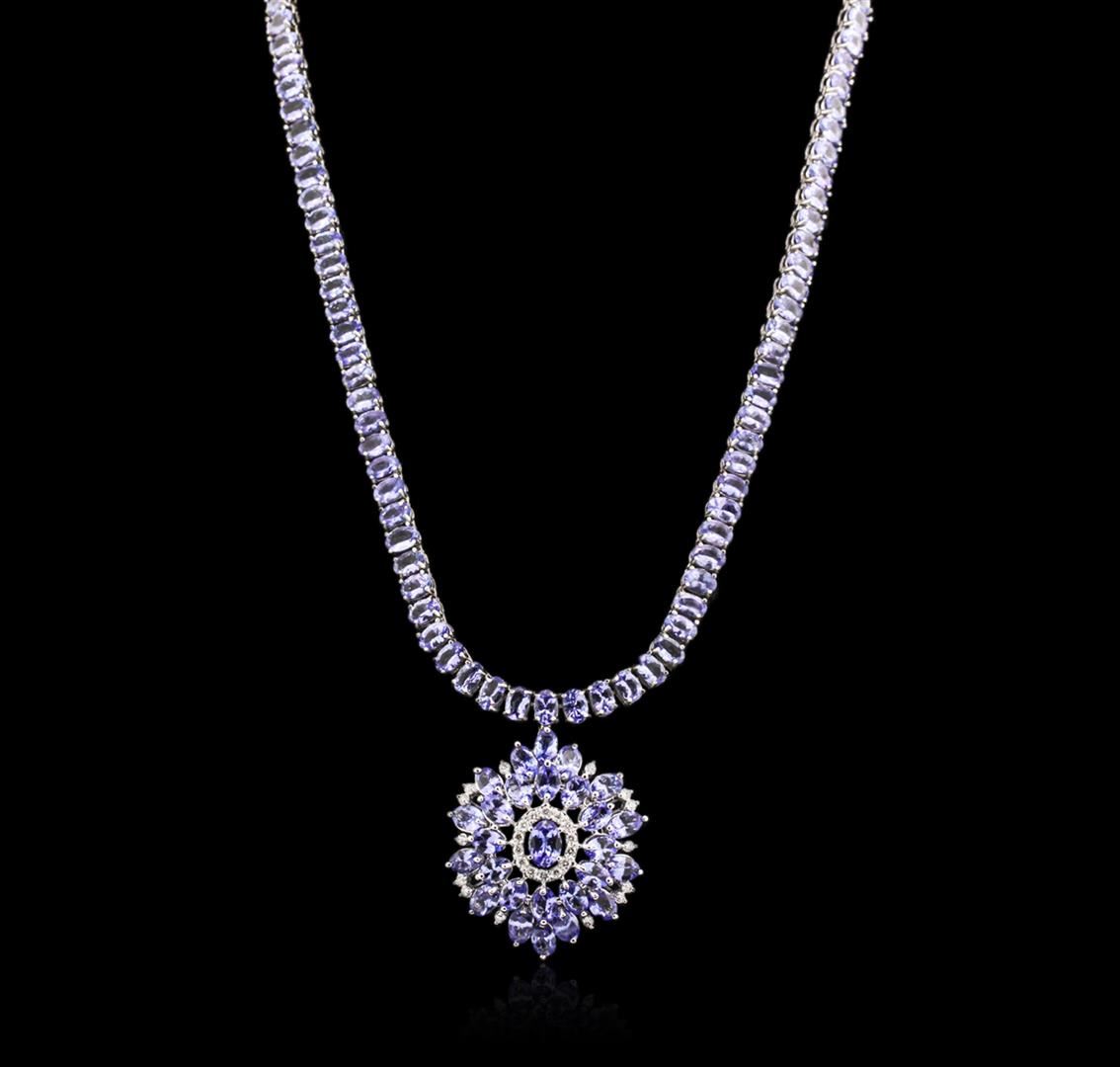 One electronically tested 14KT white gold ladies cast tanzanite and diamond necklace with a hidden box clasp with safety closer with a bright polish finish. Measurements: 17.25" in length Identified with markings of "14K". Condition is new. Containing: One prong set oval modified brilliant cut natural tanzanite, measuring 7.80 x 5.90 x 3.84mm, approximate weight of 1.24ct., clarity is eye clean, type I, medium, moderately strong, violet color, (GIA V 5/4), cut is good. One hundred eighteen prong set oval modified brilliant cut natural tanzanites, measuring 6.00 x 4.50 x 2.93mm, approximate total weight of 66.08ct., clarity is eye clean, type I, medium light, moderately strong, violet color, (GIA V 4/4), cut is good. Twenty-Eight prong set round brilliant cut diamonds, measuring 2.00 - 1.80 x 1.14mm (depth est.) approximate total weight of 28 Stones = 0.70ct. Clarity: SI-1 to I-1. Color: I - J, Cut is Good. Colored gemstones are presumed to have been subjected to commonly used enhancement processes. All diamonds and colored gemstones are graded in the mounting, unless otherwise stated. Total Weight of Colored Stones 67.32ct. Total Weight of Diamonds 0.70ct. Total Weight of Necklace 45.50 grams. GGL Appraised at $20,700.00.
