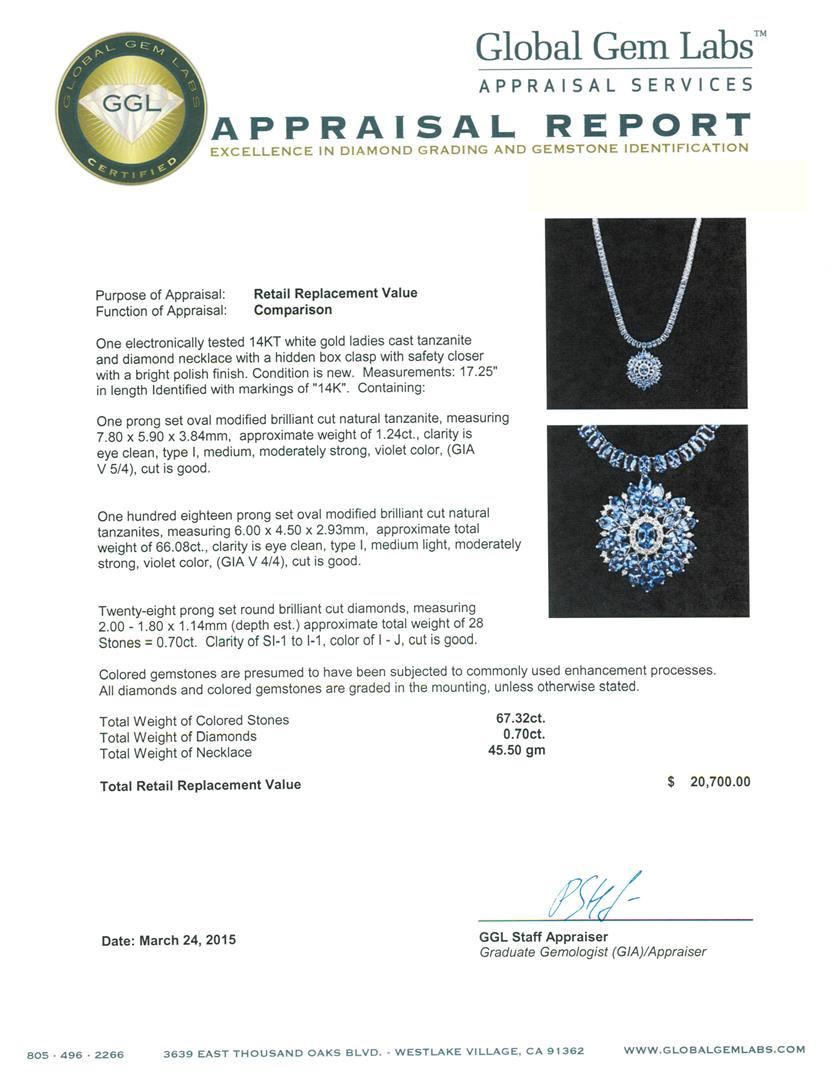 One electronically tested 14KT white gold ladies cast tanzanite and diamond necklace with a hidden box clasp with safety closer with a bright polish finish. Measurements: 17.25" in length Identified with markings of "14K". Condition is new. Containing: One prong set oval modified brilliant cut natural tanzanite, measuring 7.80 x 5.90 x 3.84mm, approximate weight of 1.24ct., clarity is eye clean, type I, medium, moderately strong, violet color, (GIA V 5/4), cut is good. One hundred eighteen prong set oval modified brilliant cut natural tanzanites, measuring 6.00 x 4.50 x 2.93mm, approximate total weight of 66.08ct., clarity is eye clean, type I, medium light, moderately strong, violet color, (GIA V 4/4), cut is good. Twenty-Eight prong set round brilliant cut diamonds, measuring 2.00 - 1.80 x 1.14mm (depth est.) approximate total weight of 28 Stones = 0.70ct. Clarity: SI-1 to I-1. Color: I - J, Cut is Good. Colored gemstones are presumed to have been subjected to commonly used enhancement processes. All diamonds and colored gemstones are graded in the mounting, unless otherwise stated. Total Weight of Colored Stones 67.32ct. Total Weight of Diamonds 0.70ct. Total Weight of Necklace 45.50 grams. GGL Appraised at $20,700.00.