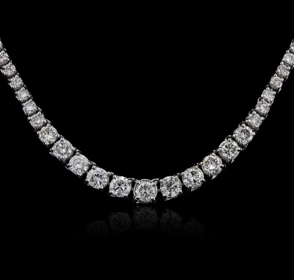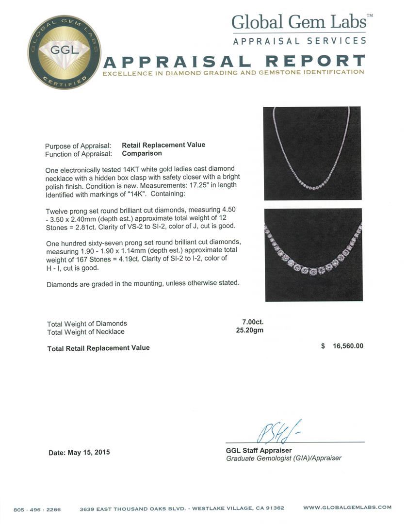 One electronically tested 14KT white gold ladies cast diamond necklace with a hidden box clasp with safety closer with a bright polish finish. Measurements: 17.25" in length Identified with markings of "14K". Condition is new. Containing: Twelve prong set round brilliant cut diamonds, measuring 4.50 - 3.50 x 2.40mm (depth est.) approximate total weight of 12 Stones = 2.81ct. Clarity: VS-2 to SI-2. Color: J, Cut is Good. One Hundred Sixty-Seven prong set round brilliant cut diamonds, measuring 1.90 - 1.90 x 1.14mm (depth est.) approximate total weight of 167 Stones = 4.19ct. Clarity: SI-2 to I-2. Color: H - I, Cut is Good. Diamonds are graded in the mounting, unless otherwise stated. Total Weight of Diamonds 7.00ct. Total Weight of Necklace 25.20 grams. GGL Appraised at $16,560.00.