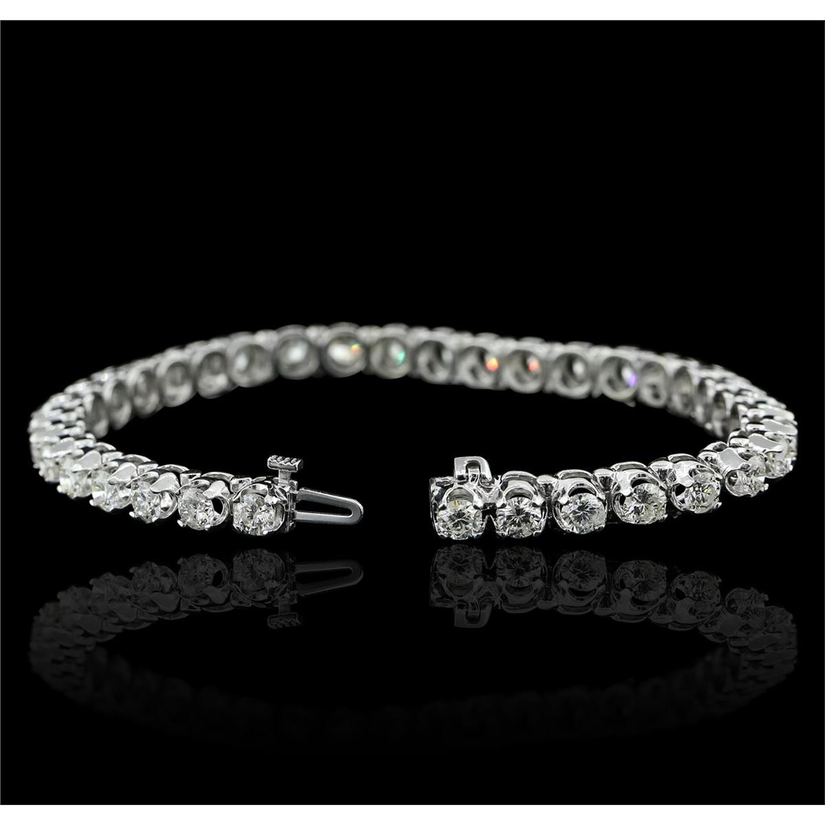 One electronically tested 14KT white gold ladies combination cast & assembled tennis bracelet with a hidden box clasp with a bright polish finish. Condition is new. Measurements: 7" in length. Identified with markings of "14K". Containing: Thirty-Five prong set round brilliant cut diamonds, measuring 3.80 - 3.80 x 2.28mm (depth est.) approximate total weight of 35 Stones = 7.03ct. Clarity: SI-1 to I-1. Color: H - J, Cut is Good. All diamonds are graded in the mounting, unless otherwise stated. Total Weight of Diamonds 7.03ct. Total Weight of Bracelet 16.10 grams. GGL Appraised at $29,815.00.