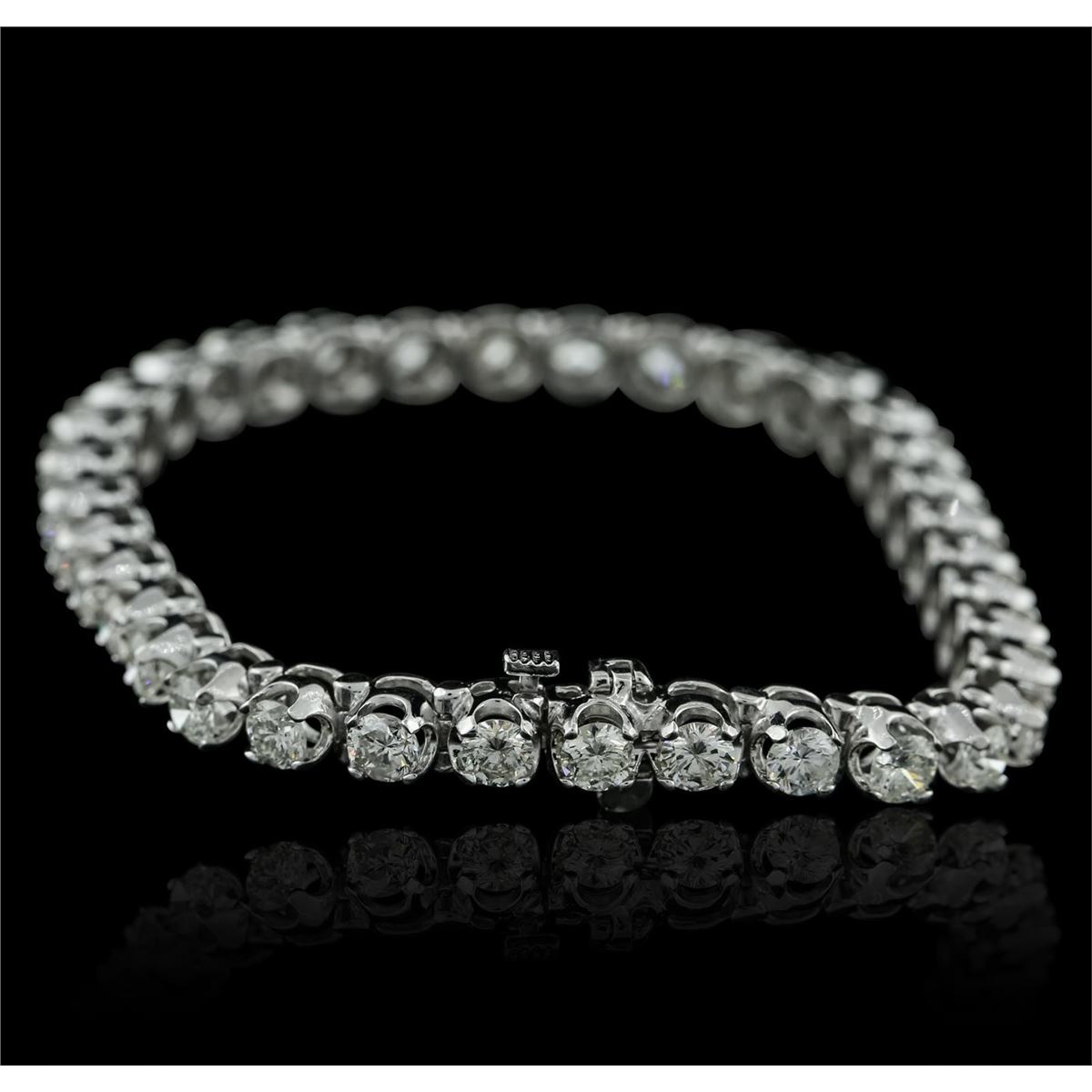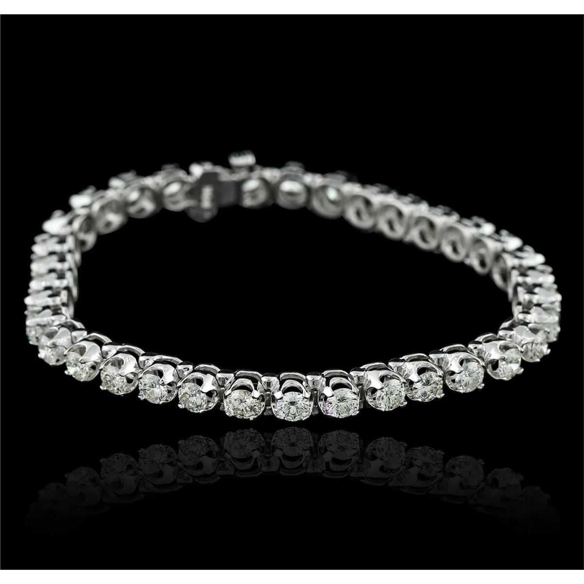 One electronically tested 14KT white gold ladies combination cast & assembled tennis bracelet with a hidden box clasp with a bright polish finish. Condition is new. Measurements: 7" in length. Identified with markings of "14K". Containing: Thirty-Five prong set round brilliant cut diamonds, measuring 3.80 - 3.80 x 2.28mm (depth est.) approximate total weight of 35 Stones = 7.03ct. Clarity: SI-1 to I-1. Color: H - J, Cut is Good. All diamonds are graded in the mounting, unless otherwise stated. Total Weight of Diamonds 7.03ct. Total Weight of Bracelet 16.10 grams. GGL Appraised at $29,815.00.