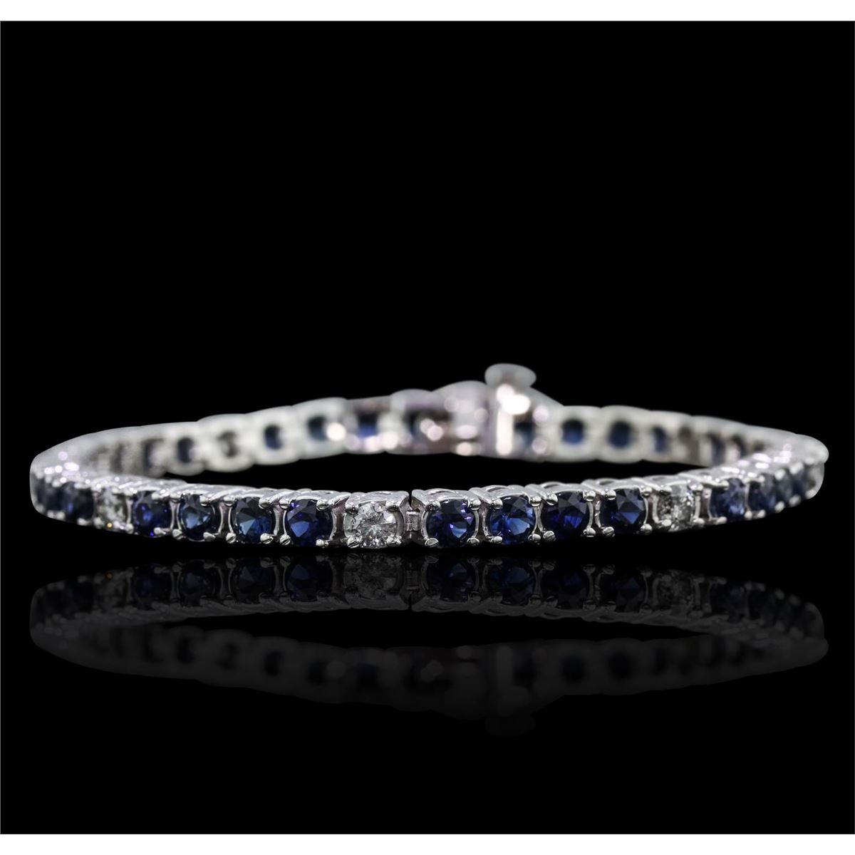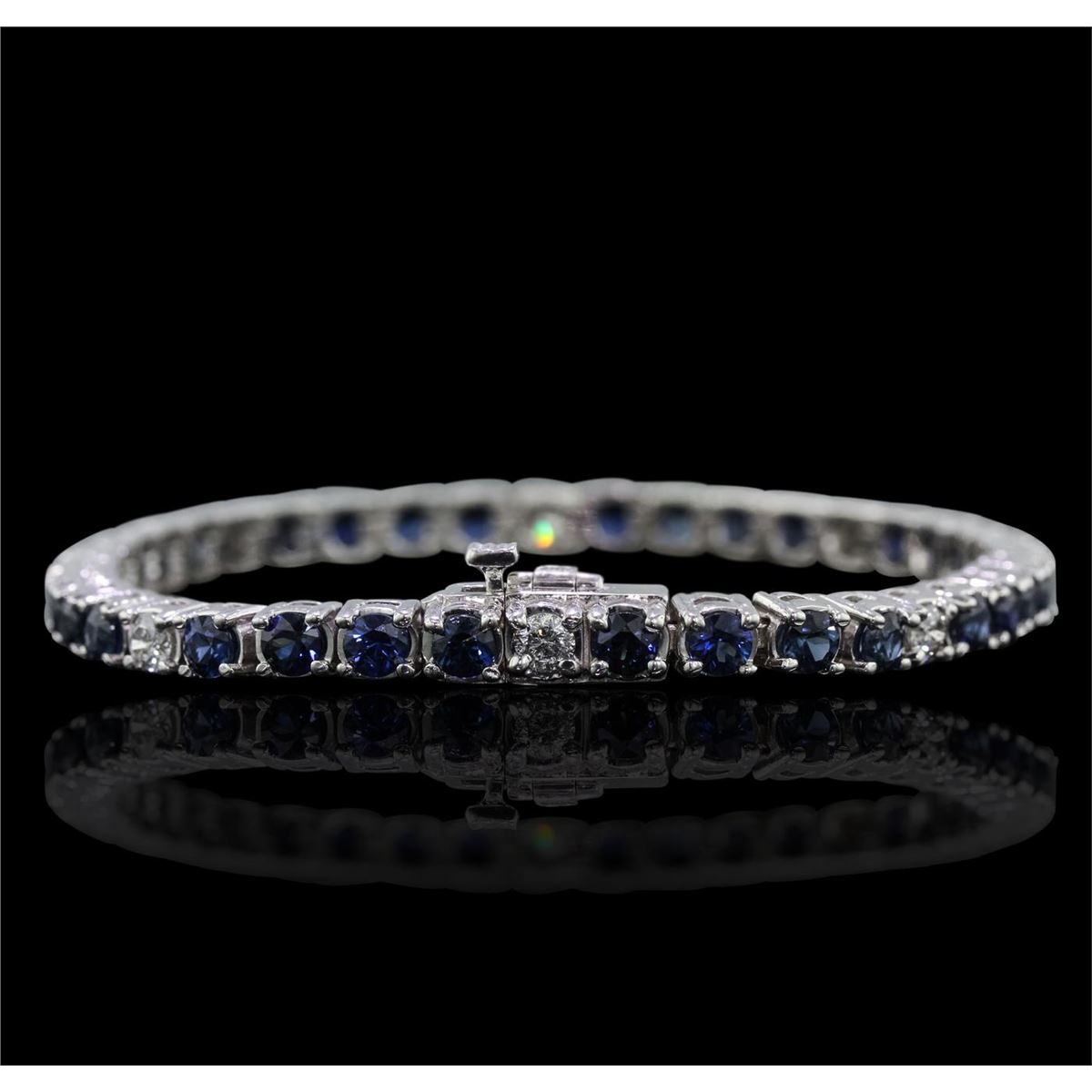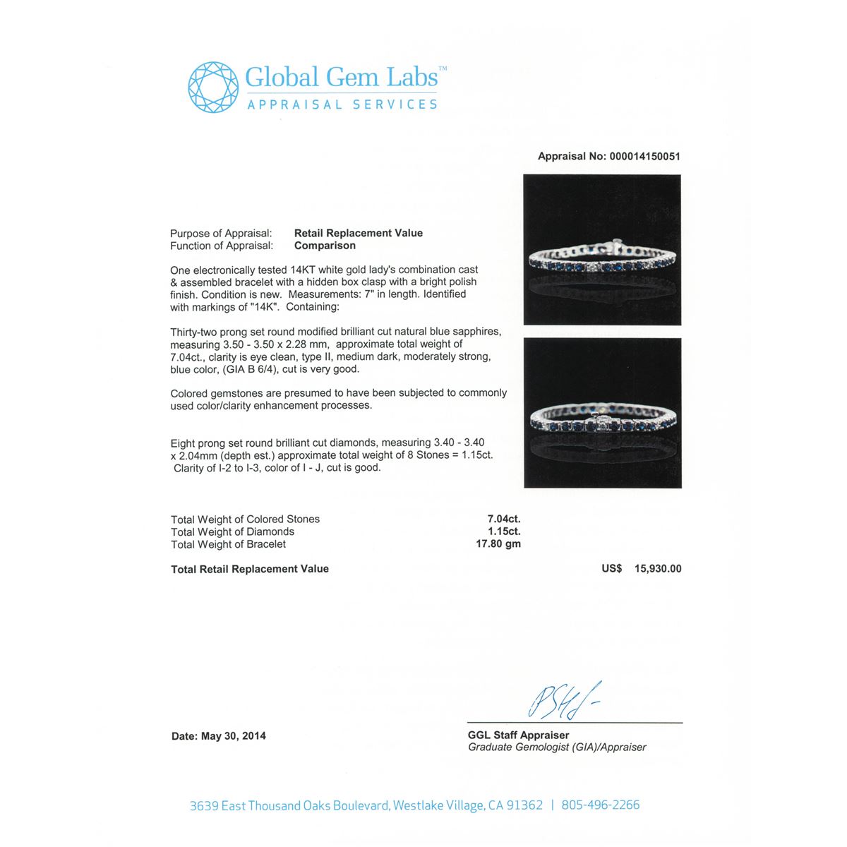 One electronically tested 14KT white gold Ladies combination cast & assembled bracelet with a hidden box clasp with a bright polish finish. Condition is new. Measurements: 7" in length. Identified with markings of "14K". Containing: Thirty-two prong set round modified brilliant cut natural blue sapphires, measuring 3.50 - 3.50 x 2.28 mm, approximate. Total Weight of 7.04ct., clarity is eye clean, type II, medium dark, moderately strong, blue color, (GIA B 6/4), cut is very good. Colored gemstones are presumed to have been subjected to commonly used color/clarity enhancement processes. Eight prong set round brilliant cut diamonds, measuring 3.40 - 3.40 x 2.04mm (depth est.) approximate. Total Weight of 8 Stones = 1.15ct. Clarity: I-2 to I-3. Color: I - J, Cut is Good. Total Weight of Colored Stones 7.04ct. Total Weight of Diamonds 1.15ct. Total Weight of Bracelet 17.80 grams. GGL Appraised at $15,930.00.
