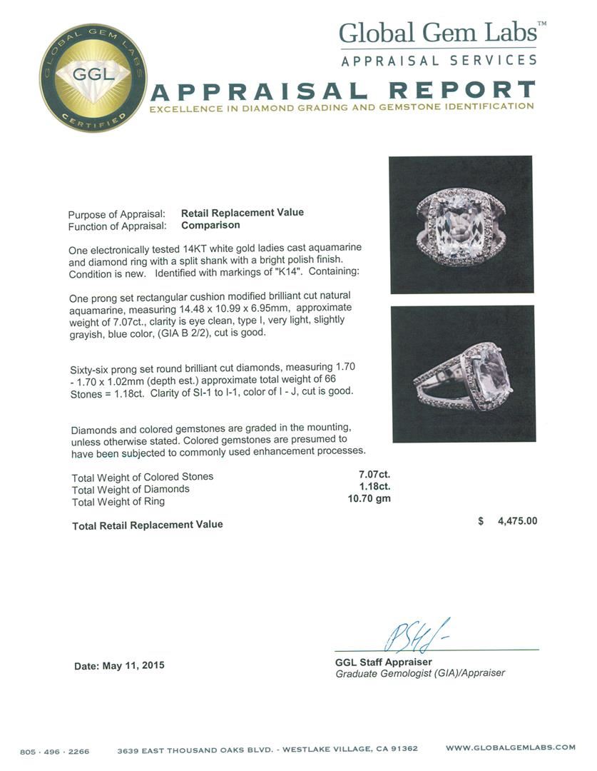 One electronically tested 14KT white gold ladies cast aquamarine and diamond ring with a split shank with a bright polish finish. Identified with markings of "K14". Condition is new. Containing: One prong set rectangular cushion modified brilliant cut natural aquamarine, measuring 14.48 x 10.99 x 6.95mm, approximate weight of 7.07ct., clarity is eye clean, type I, very light, slightly grayish, blue color, (GIA B 2/2), cut is good. Sixty-Six prong set round brilliant cut diamonds, measuring 1.70 - 1.70 x 1.02mm (depth est.) approximate total weight of 66 Stones = 1.18ct. Clarity: SI-1 to I-1. Color: I - J, Cut is Good. Diamonds and colored gemstones are graded in the mounting, unless otherwise stated. Colored gemstones are presumed to have been subjected to commonly used enhancement processes. Total Weight of Colored Stones 7.07ct. Total Weight of Diamonds 1.18ct. Total Weight of Ring 10.70 grams. GGL Appraised at $4,475.00.