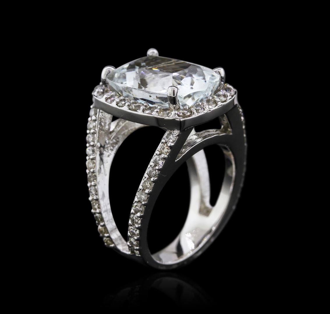 One electronically tested 14KT white gold ladies cast aquamarine and diamond ring with a split shank with a bright polish finish. Identified with markings of "K14". Condition is new. Containing: One prong set rectangular cushion modified brilliant cut natural aquamarine, measuring 14.48 x 10.99 x 6.95mm, approximate weight of 7.07ct., clarity is eye clean, type I, very light, slightly grayish, blue color, (GIA B 2/2), cut is good. Sixty-Six prong set round brilliant cut diamonds, measuring 1.70 - 1.70 x 1.02mm (depth est.) approximate total weight of 66 Stones = 1.18ct. Clarity: SI-1 to I-1. Color: I - J, Cut is Good. Diamonds and colored gemstones are graded in the mounting, unless otherwise stated. Colored gemstones are presumed to have been subjected to commonly used enhancement processes. Total Weight of Colored Stones 7.07ct. Total Weight of Diamonds 1.18ct. Total Weight of Ring 10.70 grams. GGL Appraised at $4,475.00.