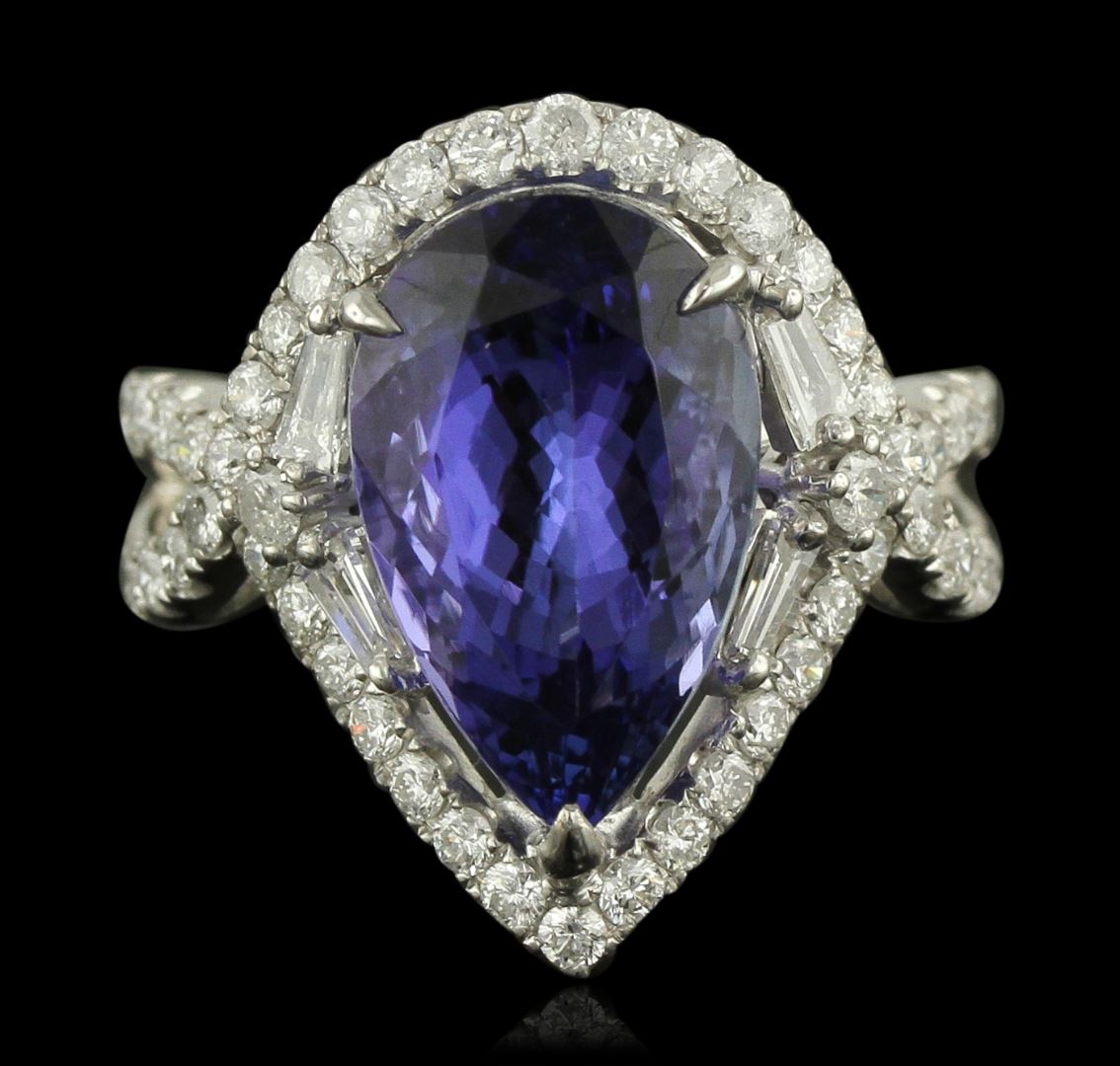 One electronically tested 14KT white gold ladies cast tanzanite and diamond ring with a bright polish finish. Condition is new, good workmanship. The featured tanzanite is set within a diamond bezel, supported by diamond set split shoulders and completed by a two and one-half millimeter wide band. Trademark is UCG. Identified with markings of "14K 585". Containing: One prong set pear mixed cut natural tanzanite, measuring 15.10 x 9.60 x 7.00mm, 8%. bulge factor, approximate weight of 7.34ct., clarity is eye clean, type I, medium, very slightly grayish, bluish violet color, (GIA bV 5/3), cut is good. Transmitting light with no distortion, transparent. Colored Stone Grading Report attached. Graded in the setting. Tanzanite is a very rare gemstone that is only found in the country of Tanzania. Originally discovered in 1967. Tiffany & Company, named the stone Tanzanite. It is found in the Usumburu Mountains that border the Umba Valley of northern Tanzania. Tanzanite occurs in gray, brown, violet, blue, reddish-purple, & green. The gem is interesting because of its exceptional pleochroism. Rotated in different directions a tanzanite will exhibit multiple changes of color. Tanzanite has a low tolerance to ultrasonic cleaning, and should not be cleaned using this method. Fifty-Four prong set round brilliant cut diamonds, measuring 1.80 - 1.70 x 1.05mm (depth est.) approximate. Total Weight of 54 Stones = 1.21ct. Graded in the setting. Clarity: SI-2 to I-2. Color: F - H Four prong set baguette cut diamonds, measuring from 3.20 x 1.20 x 0.84mm (depth est.) to 3.70 x 1.50 x 1.05mm (depth est.) approximate. Total Weight of 4 Stones = 0.20ct. Graded in the setting. Clarity: VVS-2 to VS-2. Color: F - H. Total Weight of Colored Stones 7.34ct. Total Weight of Diamonds 1.41ct. Total Weight of Ring 6.40 grams. AIG Appraised at $22,385.00.