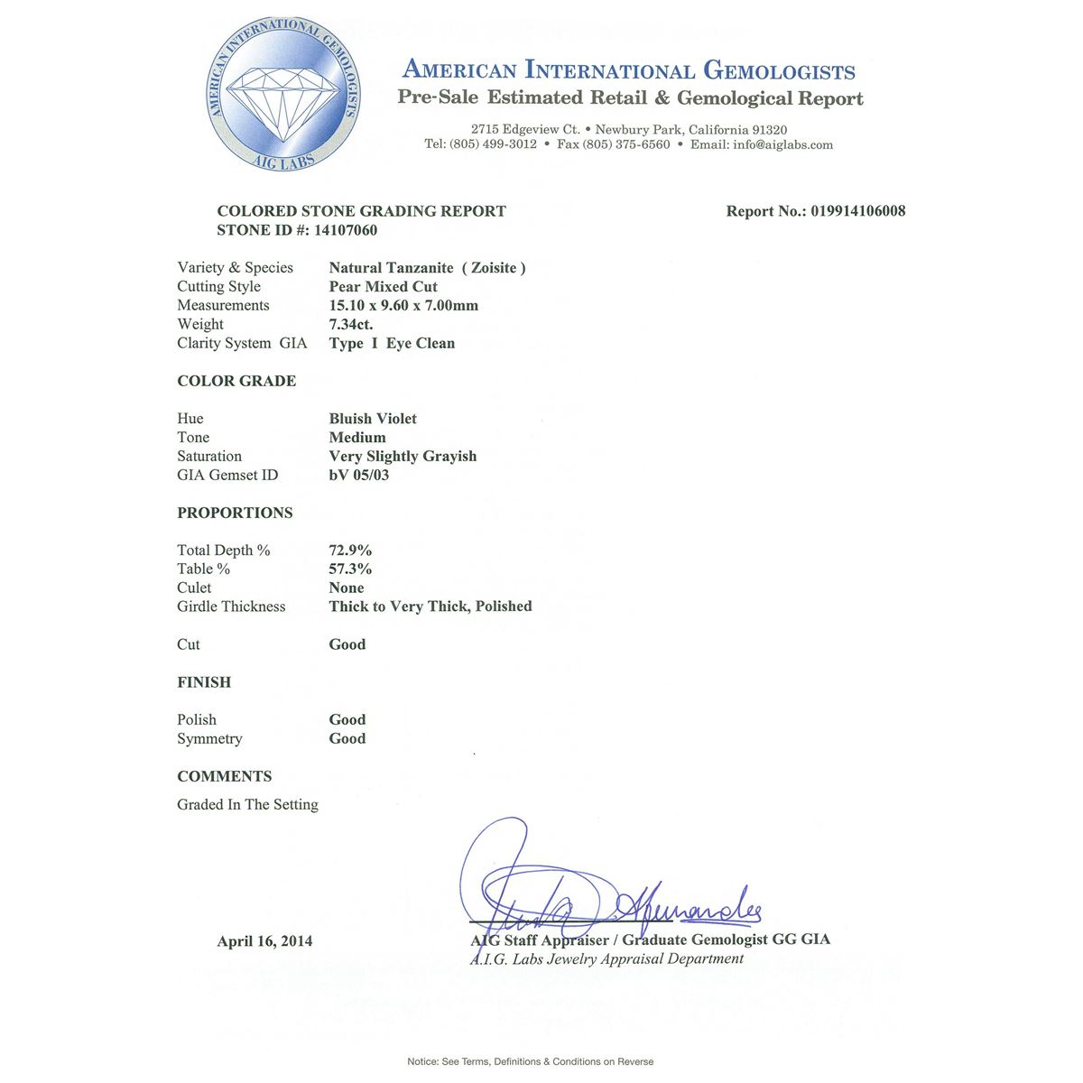 One electronically tested 14KT white gold ladies cast tanzanite and diamond ring with a bright polish finish. Condition is new, good workmanship. The featured tanzanite is set within a diamond bezel, supported by diamond set split shoulders and completed by a two and one-half millimeter wide band. Trademark is UCG. Identified with markings of "14K 585". Containing: One prong set pear mixed cut natural tanzanite, measuring 15.10 x 9.60 x 7.00mm, 8%. bulge factor, approximate weight of 7.34ct., clarity is eye clean, type I, medium, very slightly grayish, bluish violet color, (GIA bV 5/3), cut is good. Transmitting light with no distortion, transparent. Colored Stone Grading Report attached. Graded in the setting. Tanzanite is a very rare gemstone that is only found in the country of Tanzania. Originally discovered in 1967. Tiffany & Company, named the stone Tanzanite. It is found in the Usumburu Mountains that border the Umba Valley of northern Tanzania. Tanzanite occurs in gray, brown, violet, blue, reddish-purple, & green. The gem is interesting because of its exceptional pleochroism. Rotated in different directions a tanzanite will exhibit multiple changes of color. Tanzanite has a low tolerance to ultrasonic cleaning, and should not be cleaned using this method. Fifty-Four prong set round brilliant cut diamonds, measuring 1.80 - 1.70 x 1.05mm (depth est.) approximate. Total Weight of 54 Stones = 1.21ct. Graded in the setting. Clarity: SI-2 to I-2. Color: F - H Four prong set baguette cut diamonds, measuring from 3.20 x 1.20 x 0.84mm (depth est.) to 3.70 x 1.50 x 1.05mm (depth est.) approximate. Total Weight of 4 Stones = 0.20ct. Graded in the setting. Clarity: VVS-2 to VS-2. Color: F - H. Total Weight of Colored Stones 7.34ct. Total Weight of Diamonds 1.41ct. Total Weight of Ring 6.40 grams. AIG Appraised at $22,385.00.