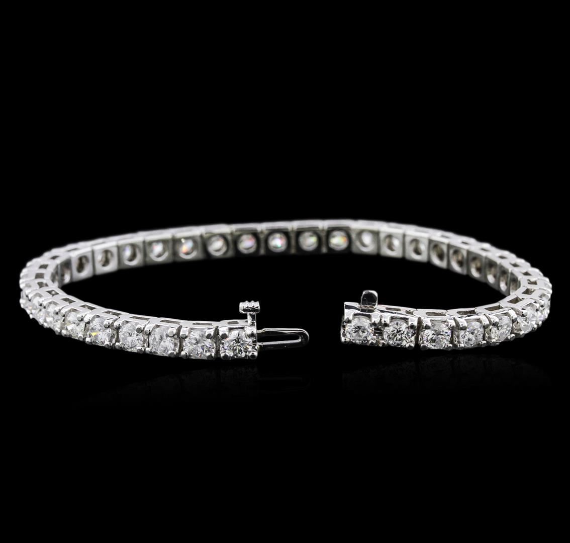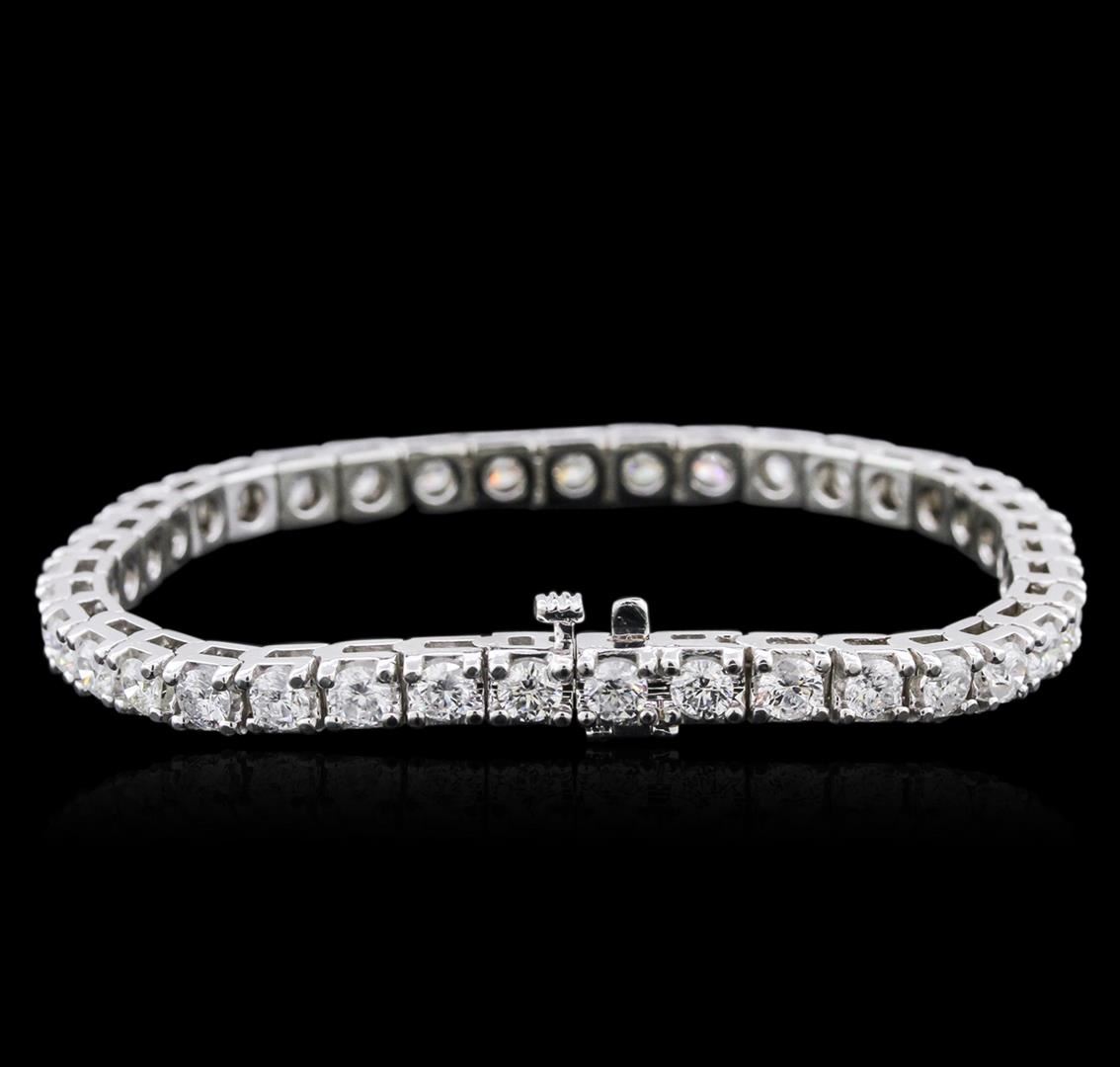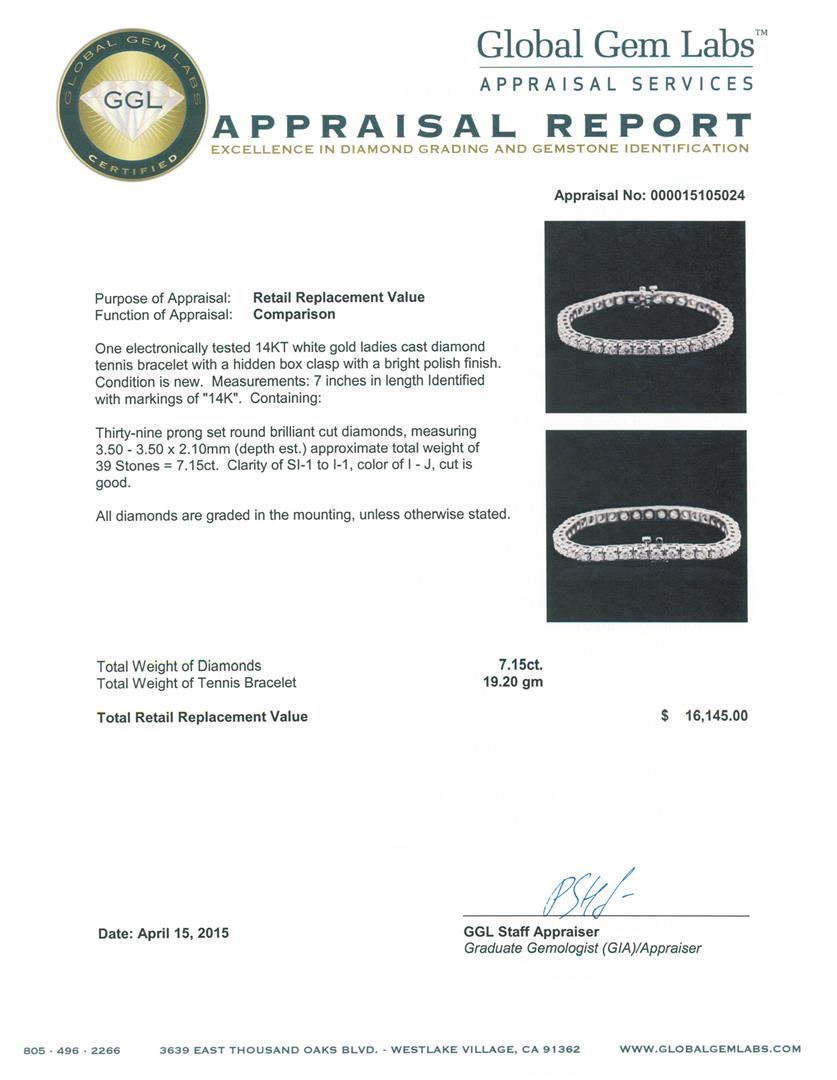 One electronically tested 14KT white gold ladies cast diamond tennis bracelet with a hidden box clasp with a bright polish finish. Measurements: 7 inches in length Identified with markings of "14K". Condition is new. Containing: Thirty-Nine prong set round brilliant cut diamonds, measuring 3.50 - 3.50 x 2.10mm (depth est.) approximate total weight of 39 Stones = 7.15ct. Clarity: SI-1 to I-1. Color: I - J, Cut is Good. All diamonds are graded in the mounting, unless otherwise stated. Total Weight of Diamonds 7.15ct. Total Weight of Tennis Bracelet 19.20 grams. GGL Appraised at $16,145.00.