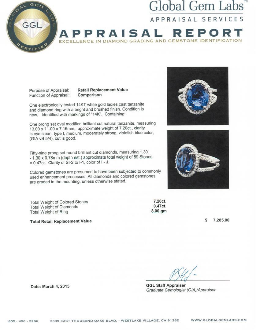 One electronically tested 14KT white gold ladies cast tanzanite and diamond ring with a bright and brushed finish. Identified with markings of "14K". Condition is new. Containing: One prong set oval modified brilliant cut natural tanzanite, measuring 13.00. x 11.00. x 7.16mm, approximate weight of 7.20ct., clarity is eye clean, type I, medium, moderately strong, violetish blue color, (GIA vB 5/4), cut is good. Fifty-Nine prong set round brilliant cut diamonds, measuring 1.30 - 1.30 x 0.78mm (depth est.) approximate total weight of 59 Stones = 0.47ct. Clarity: SI-2 to I-1. Color: I - J. Colored gemstones are presumed to have been subjected to commonly used enhancement processes. All diamonds and colored gemstones are graded in the mounting, unless otherwise stated. Total Weight of Colored Stones 7.20ct. Total Weight of Diamonds 0.47ct. Total Weight of Ring 8.00. grams. GGL Appraised at $7,285.00.
