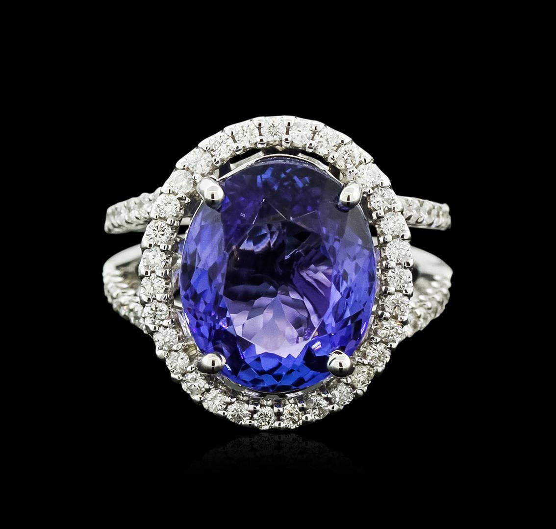 One electronically tested 14KT white gold ladies cast tanzanite and diamond ring with a bright and brushed finish. Identified with markings of "14K". Condition is new. Containing: One prong set oval modified brilliant cut natural tanzanite, measuring 13.00. x 11.00. x 7.16mm, approximate weight of 7.20ct., clarity is eye clean, type I, medium, moderately strong, violetish blue color, (GIA vB 5/4), cut is good. Fifty-Nine prong set round brilliant cut diamonds, measuring 1.30 - 1.30 x 0.78mm (depth est.) approximate total weight of 59 Stones = 0.47ct. Clarity: SI-2 to I-1. Color: I - J. Colored gemstones are presumed to have been subjected to commonly used enhancement processes. All diamonds and colored gemstones are graded in the mounting, unless otherwise stated. Total Weight of Colored Stones 7.20ct. Total Weight of Diamonds 0.47ct. Total Weight of Ring 8.00. grams. GGL Appraised at $7,285.00.
