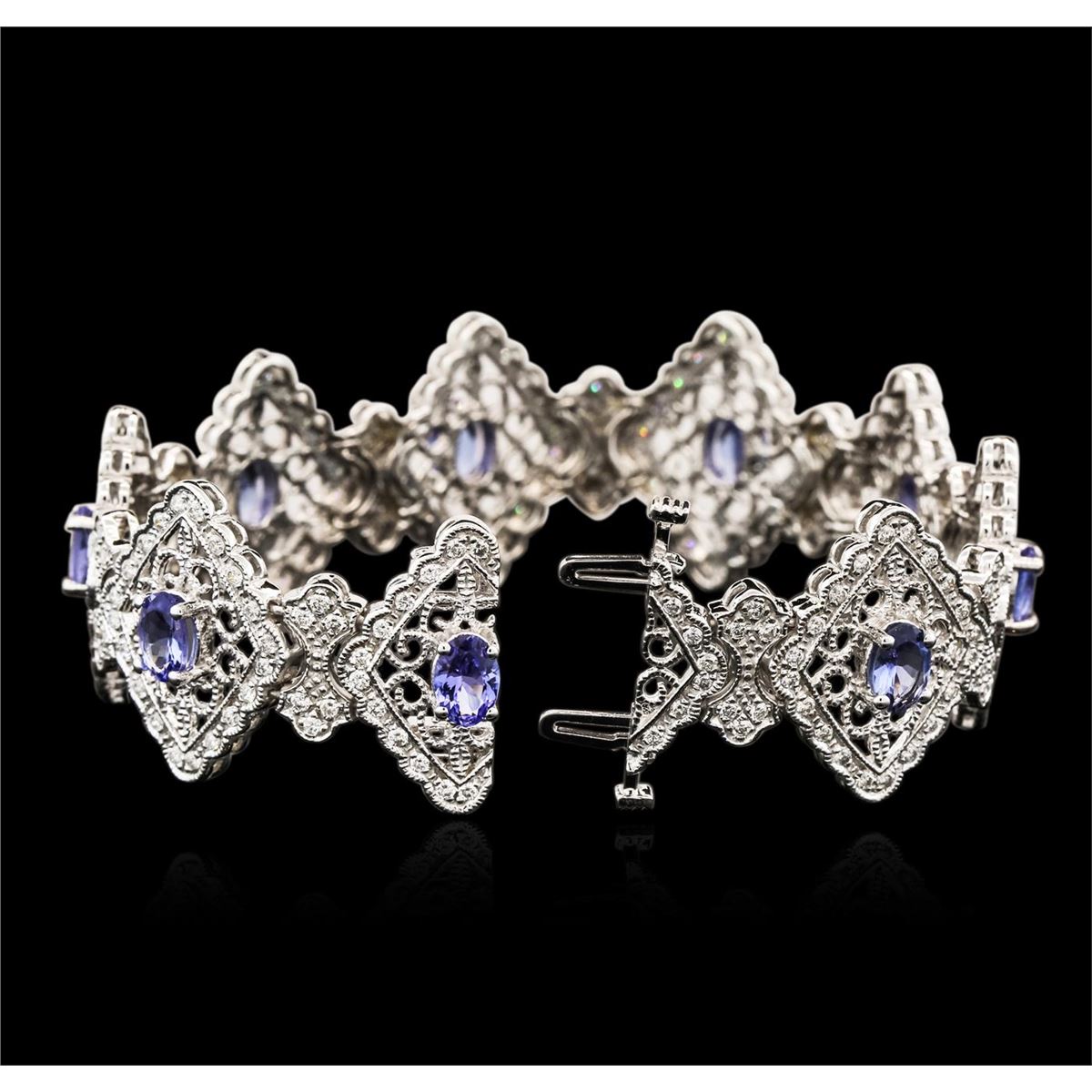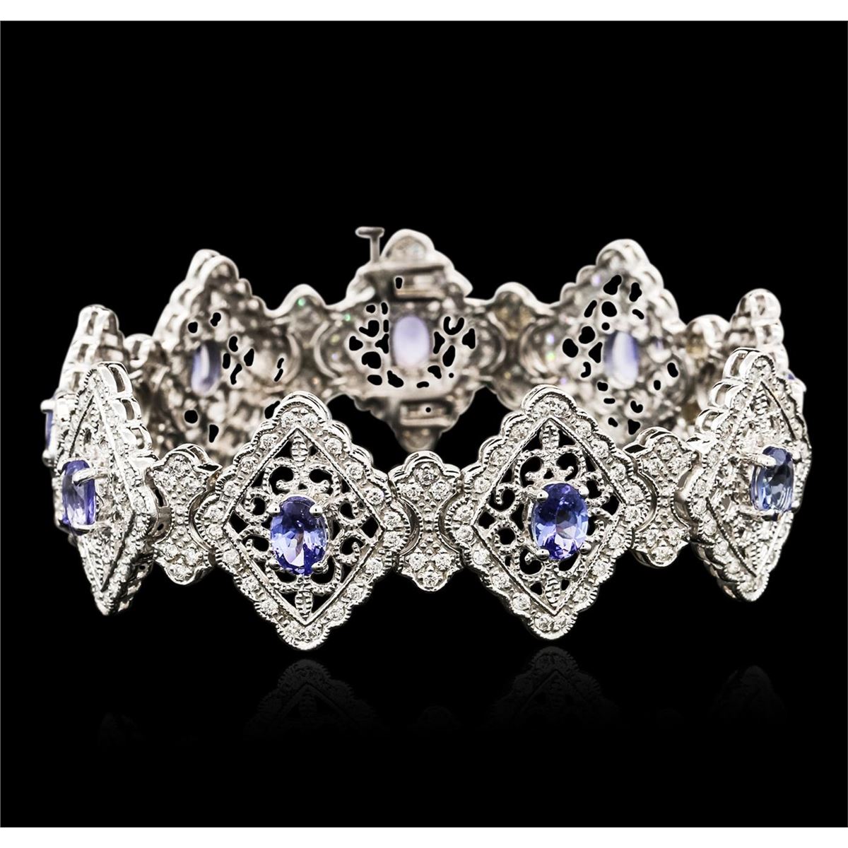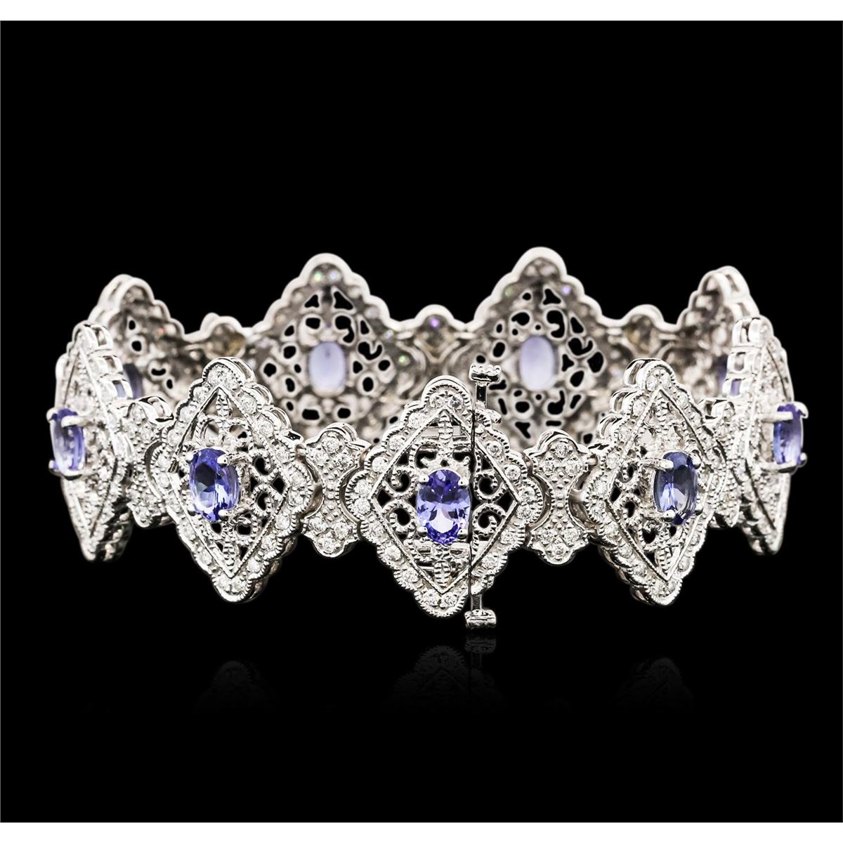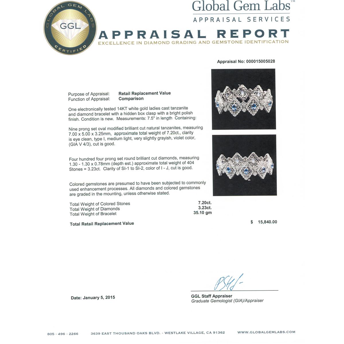 One electronically tested 14KT white gold ladies cast tanzanite and diamond bracelet with a hidden box clasp with a bright polish finish. Measurements: 7.5" in length Condition is new. Containing: Nine prong set oval modified brilliant cut natural tanzanites, measuring 7.00 x 5.00 x 3.25mm, approximate total weight of 7.20ct., clarity is eye clean, type I, medium light, very slightly grayish, violet color, (GIA V 4/3), cut is good. Four Hundred Four prong set round brilliant cut diamonds, measuring 1.30 - 1.30 x 0.78mm (depth est.) approximate total weight of 404 Stones = 3.23ct. Clarity: SI-1 to SI-2. Color: I - J, Cut is Good. Colored gemstones are presumed to have been subjected to commonly used enhancement processes. All diamonds and colored gemstones are graded in the mounting, unless otherwise stated. Total Weight of Colored Stones 7.20ct. Total Weight of Diamonds 3.23ct. Total Weight of Bracelet 35.10 grams. GGL Appraised at $15,840.00.