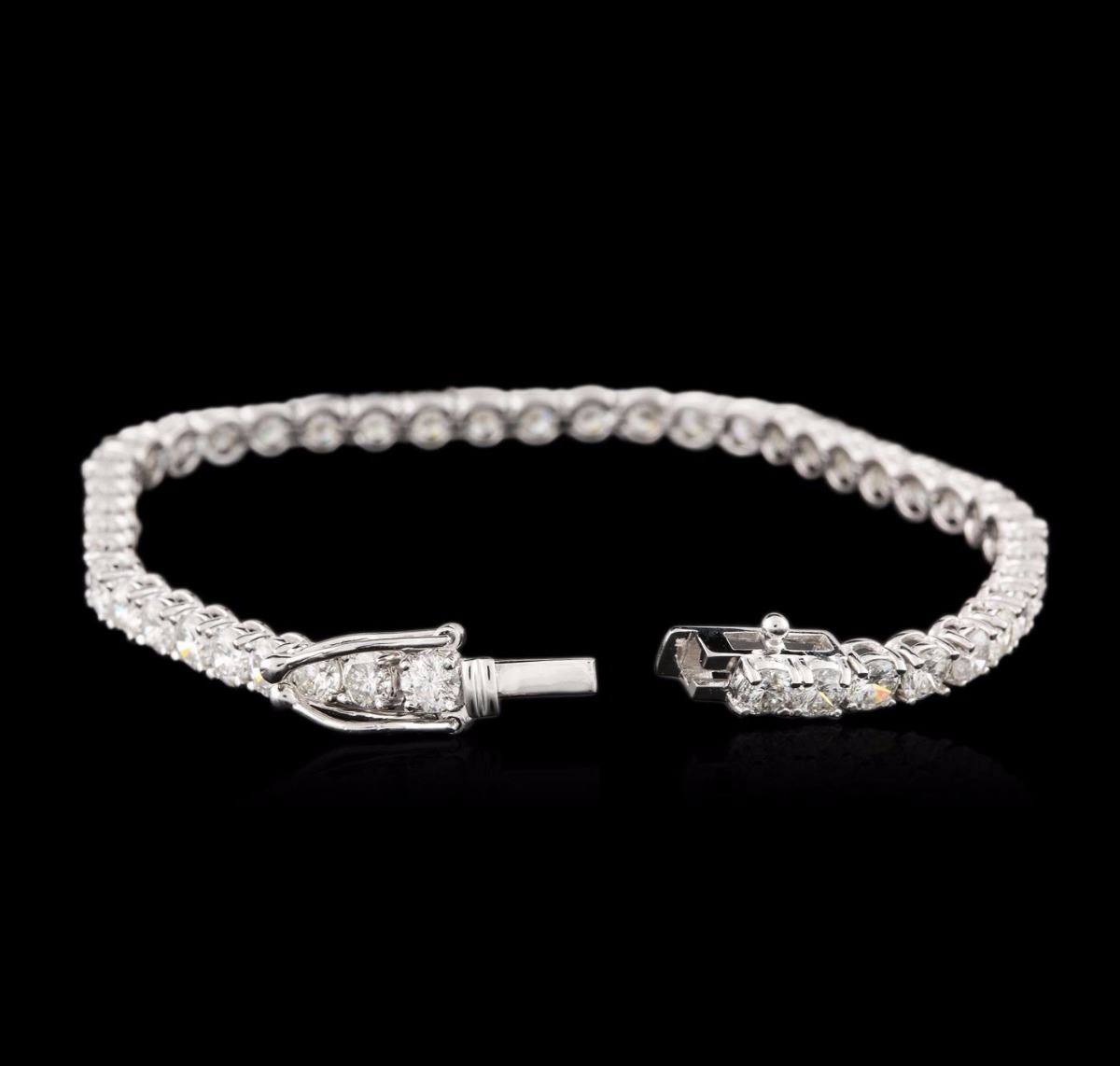 One electronically tested 14KT white gold ladies cast diamond tennis bracelet with a hidden box clasp with a bright and brushed finish. Measurements: 6.75." in length. Identified with markings of "14K". Condition is new. Containing: Forty-Six prong set round brilliant cut diamonds, measuring 3.50 - 3.50 x 2.10mm (depth est.) approximate total weight of 46 Stones = 7.22ct. Clarity: SI-1 to I-1. Color: I - K. All diamonds are graded in the mounting, unless otherwise stated. Total Weight of Diamonds 7.22ct. Total Weight of Tennis Bracelet 12.80 grams. GGL Appraised at $17,785.00.