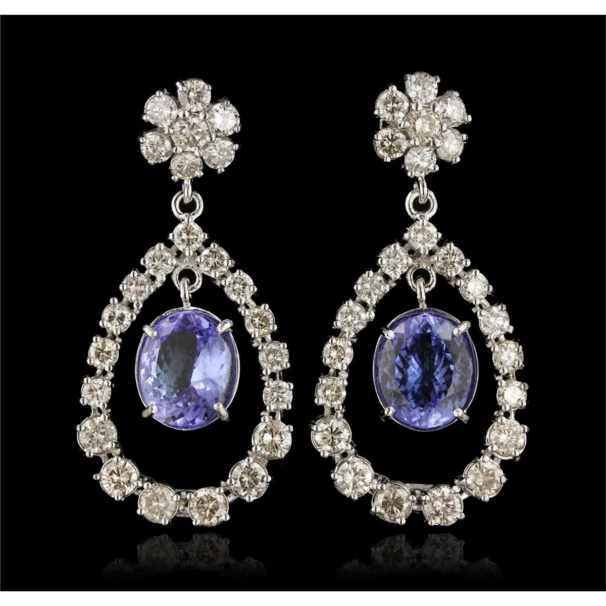 One pair electronically tested 14KT white gold ladies cast & assembled tanzanite and diamond dangle earrings with standard backs. Bright polish finish. Identified with markings of "14K". Condition is new, good workmanship. Containing: Two prong set oval mixed cut natural tanzanites, measuring 11.00 x 9.00 x 5.85mm, approximate. Total Weight of 7.22ct., clarity is eye clean, type I, medium, very slightly grayish, bluish violet color, (GIA bV 5/3), cut is good. Transmitting light with no distortion, transparent. Measurements & the color grade are an average for the pair. Graded in the setting. Tanzanite is a very rare gemstone that is only found in the country of Tanzania. Originally discovered in 1967. Tiffany & Company, named the stone Tanzanite. It is found in the Usumburu Mountains that border the Umba Valley of northern Tanzania. Tanzanite occurs in gray, brown, violet, blue, reddish-purple, & green. The gem is interesting because of its exceptional pleochroism. Rotated in different directions a tanzanite will exhibit multiple changes of color. Tanzanite has a low tolerance to ultrasonic cleaning, and should not be cleaned using this method. Forty-Eight prong set round brilliant cut diamonds, measuring 3.50 - 2.70 x 1.86mm (depth est.) approximate. Total Weight of 48 Stones = 5.53ct. Graded in the setting. Clarity: SI-2 to I-1 . Color: J - L. Total Weight of Colored Stones 7.22ct.. Total Weight of Diamonds 5.53ct. AIG Appraised at $30,140.00.