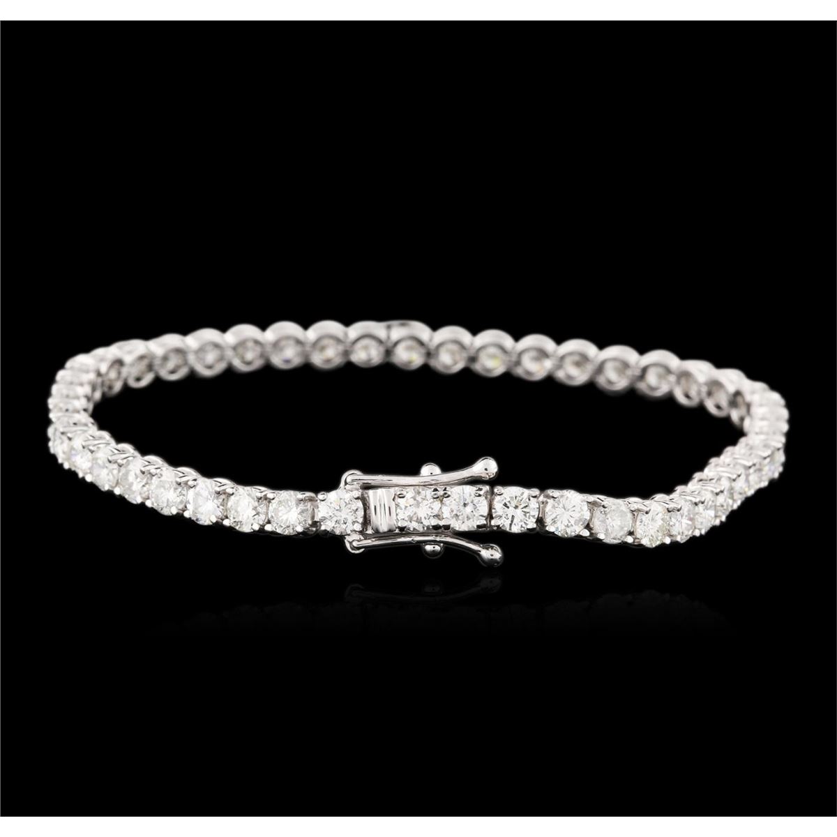 One electronically tested 14KT white gold ladies cast diamond tennis bracelet with a hidden box clasp with a bright and brushed finish. Measurements: 6.75." in length. Identified with markings of "14K". Condition is new. Containing: Forty-Six prong set round brilliant cut diamonds, measuring 3.50 - 3.50 x 2.10mm (depth est.) approximate total weight of 46 Stones = 7.22ct. Clarity: SI-1 to I-1. Color: I - K. All diamonds are graded in the mounting, unless otherwise stated. Total Weight of Diamonds 7.22ct. Total Weight of Tennis Bracelet 12.80 grams. GGL Appraised at $17,785.00.