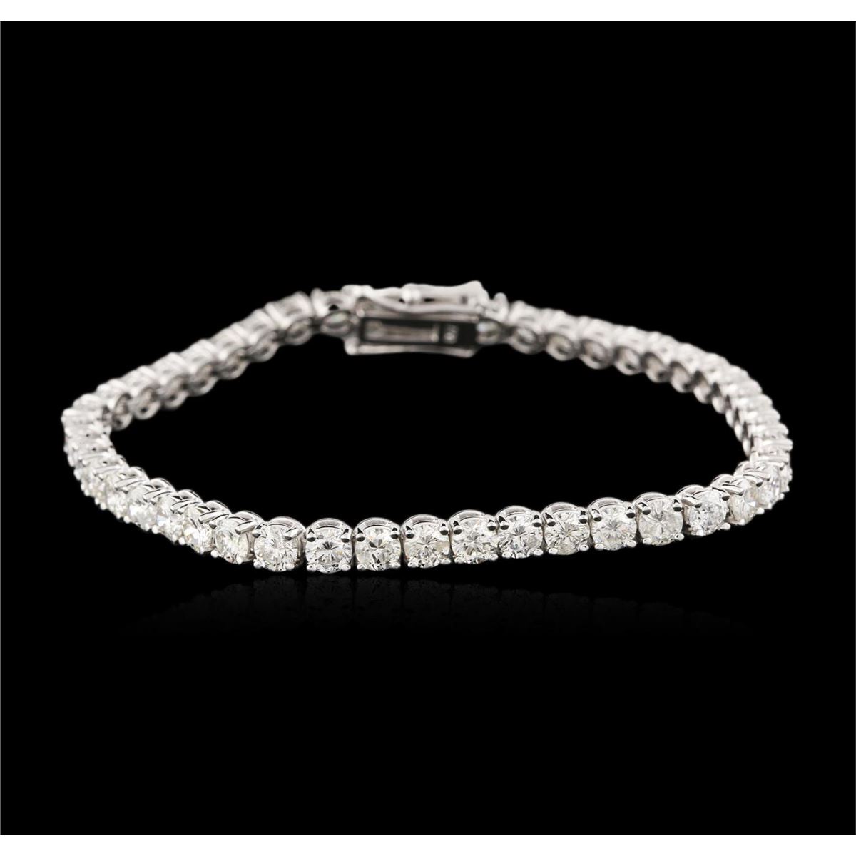 One electronically tested 14KT white gold ladies cast diamond tennis bracelet with a hidden box clasp with a bright and brushed finish. Measurements: 6.75." in length. Identified with markings of "14K". Condition is new. Containing: Forty-Six prong set round brilliant cut diamonds, measuring 3.50 - 3.50 x 2.10mm (depth est.) approximate total weight of 46 Stones = 7.22ct. Clarity: SI-1 to I-1. Color: I - K. All diamonds are graded in the mounting, unless otherwise stated. Total Weight of Diamonds 7.22ct. Total Weight of Tennis Bracelet 12.80 grams. GGL Appraised at $17,785.00.
