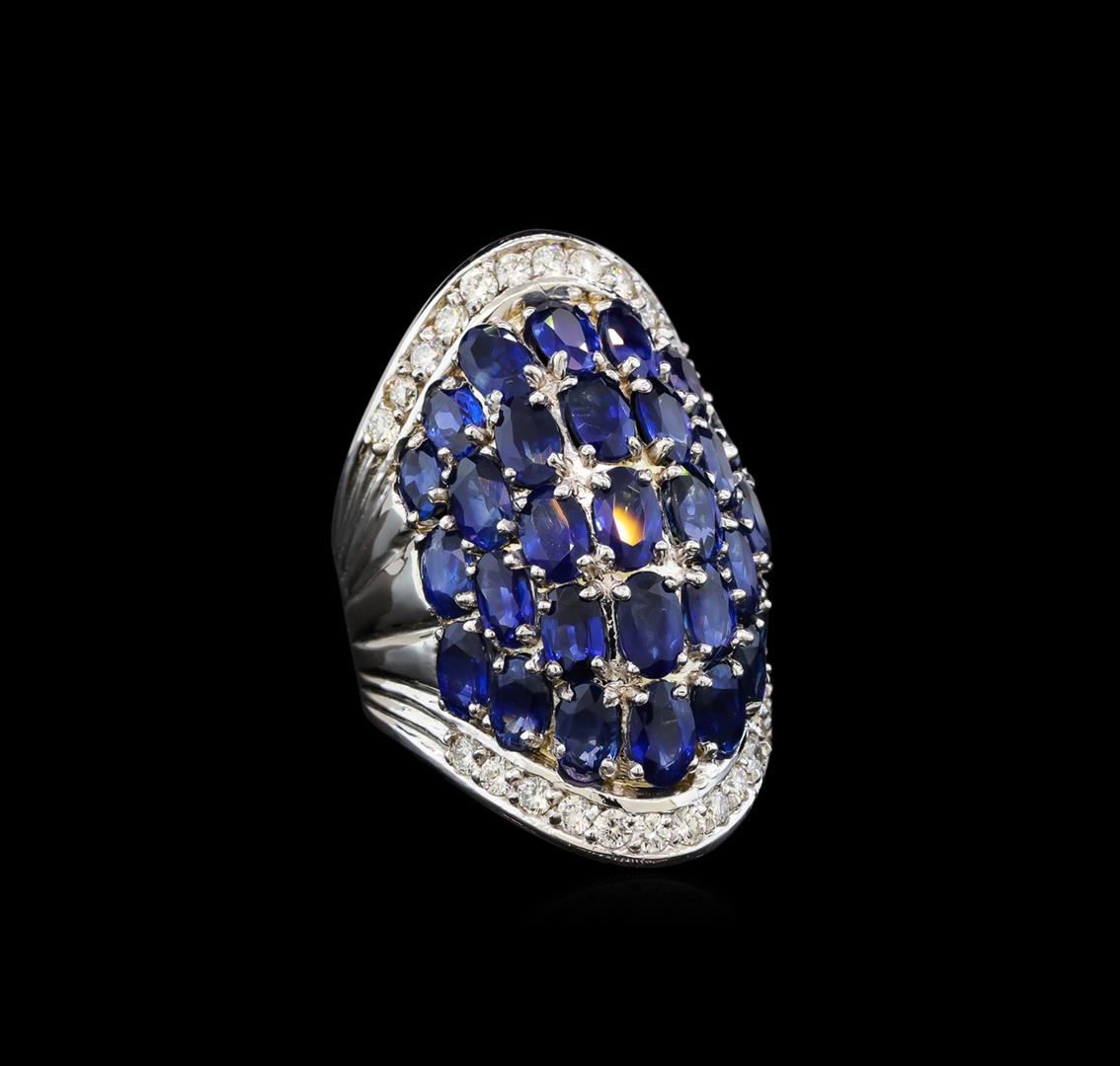 One electronically tested 14KT white gold ladies cast sapphire and diamond ring with a bright polish finish. Identified with markings of "14K". Condition is new. Containing: Twenty-nine prong set oval modified brilliant cut natural blue sapphires, measuring 5.00. x 3.00. x 1.95mm, approximate total weight of 7.25ct., clarity is slightly included, type II, medium, moderately strong, blue color, (GIA B 5/4), cut is good. Twenty-Four prong set round brilliant cut diamonds, measuring 1.80 - 1.80 x 1.08mm (depth est.) approximate total weight of 24 Stones = 0.51ct. Clarity: VS-2 to SI-1. Color: I - J, Cut is Good. Colored gemstones are presumed to have been subjected to commonly used enhancement processes. All diamonds and colored gemstones are graded in the mounting, unless otherwise stated. Total Weight of Colored Stones 7.25ct. Total Weight of Diamonds 0.51ct. Total Weight of Ring 14.50 grams. GGL Appraised at $5,795.00.