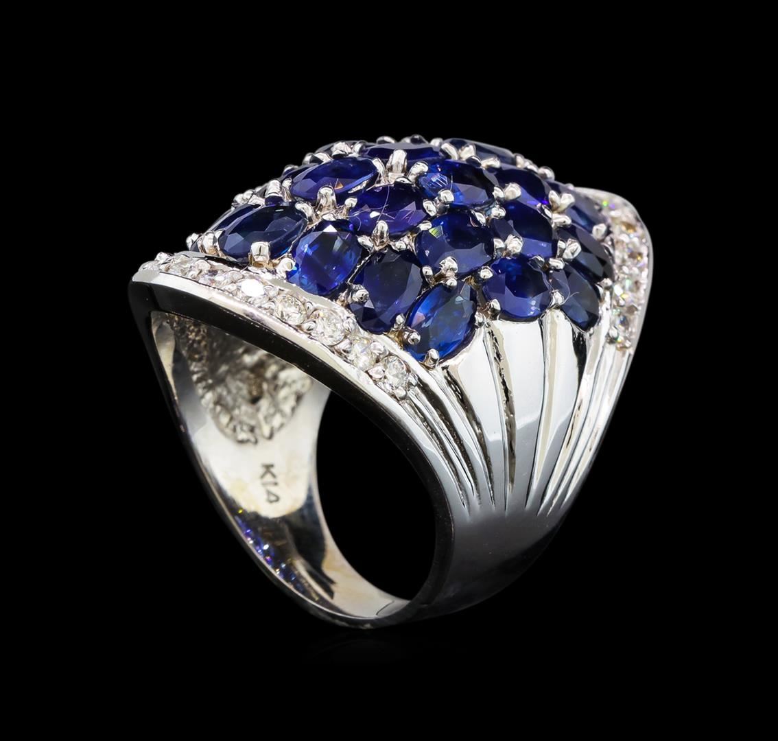 One electronically tested 14KT white gold ladies cast sapphire and diamond ring with a bright polish finish. Identified with markings of "14K". Condition is new. Containing: Twenty-nine prong set oval modified brilliant cut natural blue sapphires, measuring 5.00. x 3.00. x 1.95mm, approximate total weight of 7.25ct., clarity is slightly included, type II, medium, moderately strong, blue color, (GIA B 5/4), cut is good. Twenty-Four prong set round brilliant cut diamonds, measuring 1.80 - 1.80 x 1.08mm (depth est.) approximate total weight of 24 Stones = 0.51ct. Clarity: VS-2 to SI-1. Color: I - J, Cut is Good. Colored gemstones are presumed to have been subjected to commonly used enhancement processes. All diamonds and colored gemstones are graded in the mounting, unless otherwise stated. Total Weight of Colored Stones 7.25ct. Total Weight of Diamonds 0.51ct. Total Weight of Ring 14.50 grams. GGL Appraised at $5,795.00.