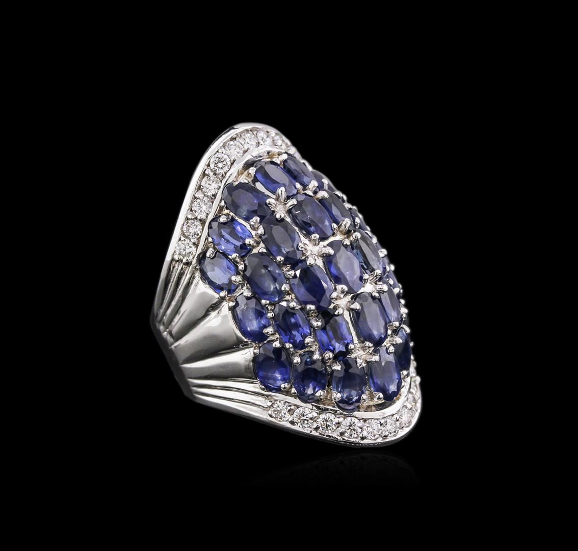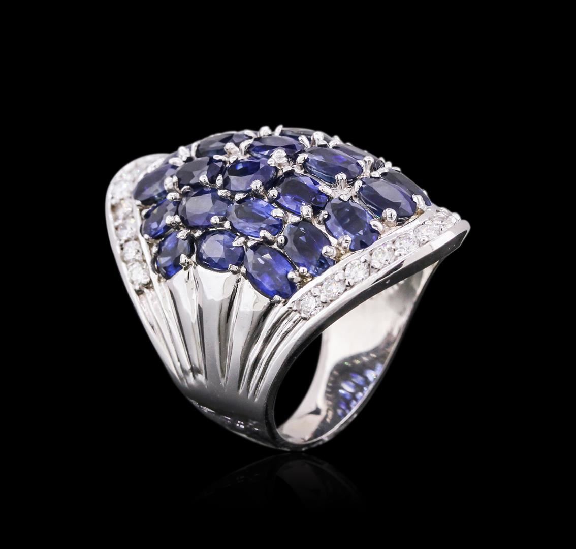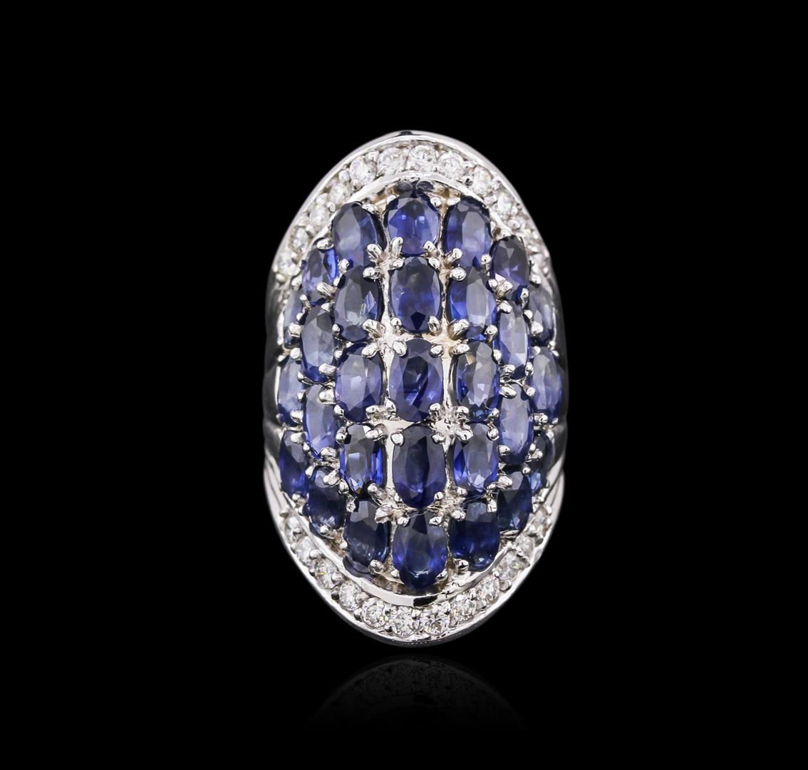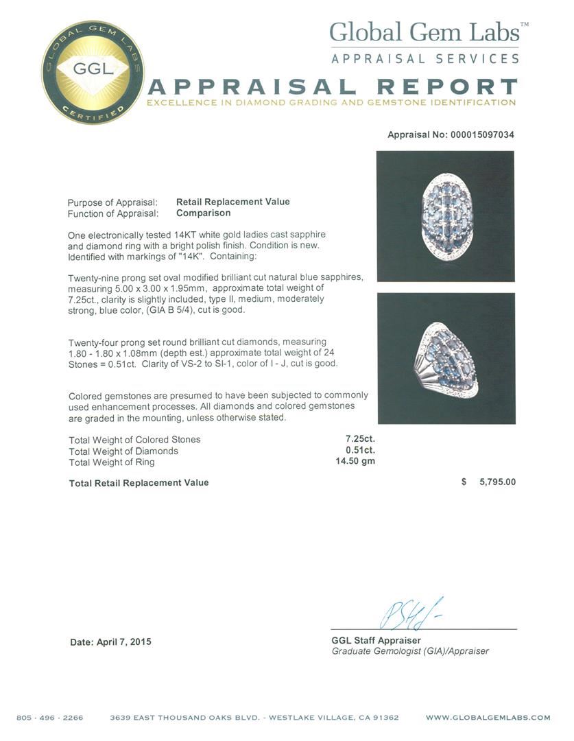 One electronically tested 14KT white gold ladies cast sapphire and diamond ring with a bright polish finish. Identified with markings of "14K". Condition is new. Containing: Twenty-nine prong set oval modified brilliant cut natural blue sapphires, measuring 5.00. x 3.00. x 1.95mm, approximate total weight of 7.25ct., clarity is slightly included, type II, medium, moderately strong, blue color, (GIA B 5/4), cut is good. Twenty-Four prong set round brilliant cut diamonds, measuring 1.80 - 1.80 x 1.08mm (depth est.) approximate total weight of 24 Stones = 0.51ct. Clarity: VS-2 to SI-1. Color: I - J, Cut is Good. Colored gemstones are presumed to have been subjected to commonly used enhancement processes. All diamonds and colored gemstones are graded in the mounting, unless otherwise stated. Total Weight of Colored Stones 7.25ct. Total Weight of Diamonds 0.51ct. Total Weight of Ring 14.50 grams. GGL Appraised at $5,795.00.