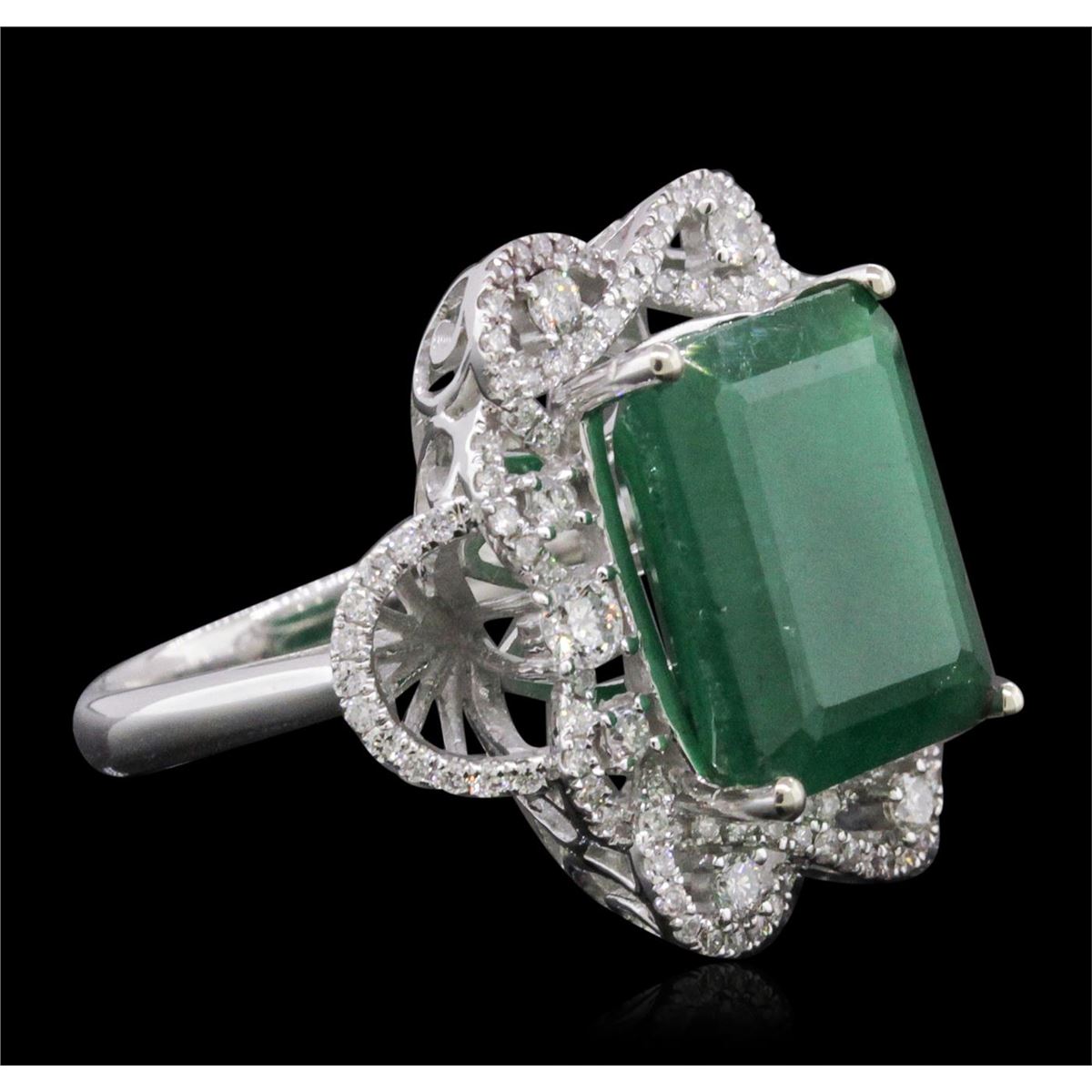 One electronically tested 14KT white gold ladies combination cast & assembled emerald and diamond ring with a flat shank with a bright polish finish. Identified with markings of "14K". Condition is new. Containing: One prong set emerald standard step cut natural emerald, measuring 13.22 x 10.63 x 7.08mm, approximate weight of 7.31ct., clarity is heavily included, type III, medium dark, moderately strong, green color, (GIA G 6/4), cut is good. Seventy-Six prong set round brilliant cut diamonds, measuring 1.30 - 1.30 x 0.78mm (depth est.) approximate total weight of 76 Stones = 0.61ct. Clarity: SI-2 to I-1. Color: H - I, Cut is Good. Ten prong set round brilliant cut diamonds, measuring 2.50 - 1.50 x 1.20mm (depth est.) approximate total weight of 10 Stones = 0.29ct. Clarity: SI-1 to SI-2. Color: H - I, Cut is Good. Colored gemstones are presumed to have been subjected to commonly used enhancement processes. All diamonds and colored gemstones are graded in the mounting, unless otherwise stated. Total Weight of Colored Stones 7.31ct. Total Weight of Diamonds 0.90ct. Total Weight of Ring 8.10 grams. GGL Appraised at $9,290.00.