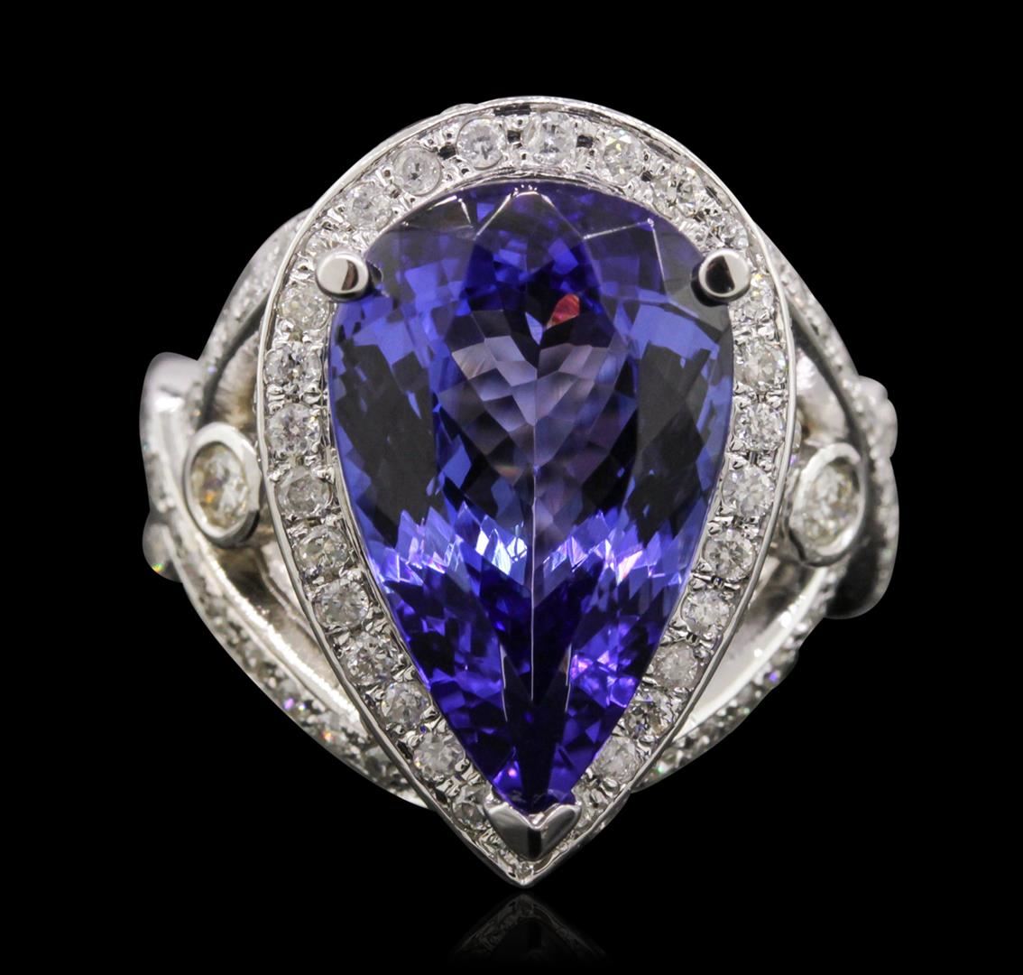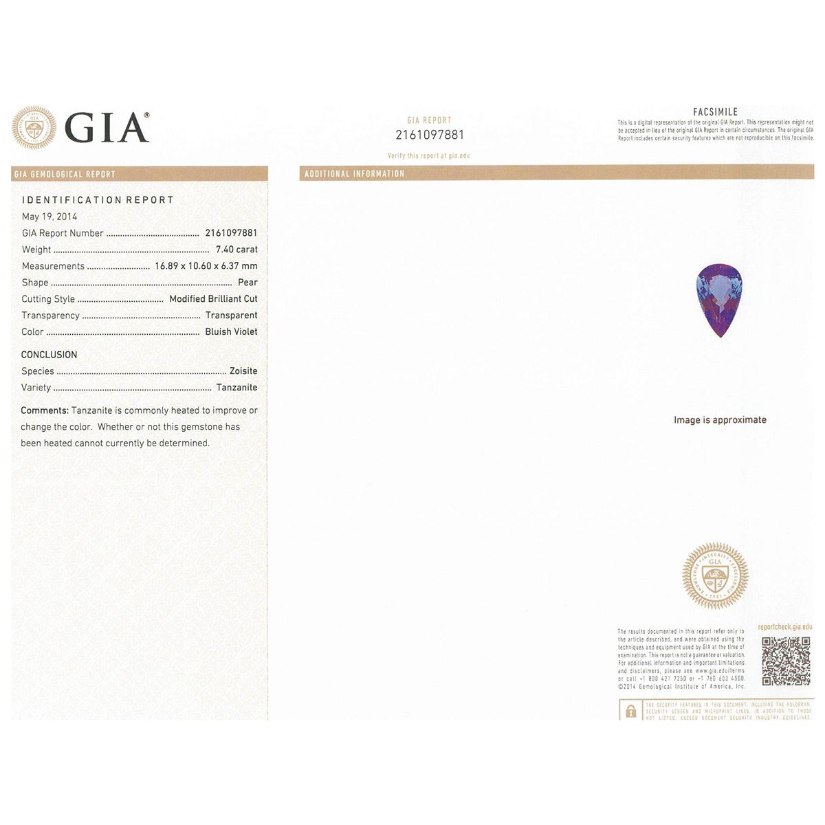 One electronically tested 14KT white gold ladies cast tanzanite and diamond ring with a bright polish finish. Condition is new, good workmanship. The featured tanzanite is set within a diamond bezel supported by stylized intertwining diamond set shoulders, completed by a three and one-half millimeter wide band. Identified with markings of "14K". Containing: One prong set pear modified brilliant cut natural tanzanite, measuring 16.89 x 10.60 x 6.37mm, exact weight 7.40ct., clarity is eye clean, type I, medium dark, moderately strong, bluish violet color, (GIA bV 6/4), cut is good. Transmitting light with no distortion, transparent. GIA Gemological Report attached. Graded loose prior to setting in the GIA Laboratory, Report #2161097881.Tanzanite is a very rare gemstone that is only found in the country of Tanzania. Originally discovered in 1967. Tiffany & Company, named the stone Tanzanite. It is found in the Usumburu Mountains that border the Umba Valley of northern Tanzania. Tanzanite occurs in gray, brown, violet, blue, reddish-purple, & green. The gem is interesting because of its exceptional pleochroism. Rotated in different directions a tanzanite will exhibit multiple changes of color. Tanzanite has a low tolerance to ultrasonic cleaning, and should not be cleaned using this method. Two bezel set round brilliant cut diamonds, measuring 2.50 - 2.50 x 1.50mm (depth est.) approximate. Total Weight of 2 Stones = 0.15ct. Graded in the setting. Clarity: SI-2 to I-1. Color: H - I One Hundred Thirty prong and bezel set round brilliant cut diamonds, measuring 1.50 - 1.40 x 0.87mm (depth est.) approximate. Total Weight of 130 Stones = 1.54ct. Graded in the setting. Clarity: SI-2 to I-2. Color: G - I. Total Weight of Colored Stones 7.40ct. Total Weight of Diamonds 1.69ct. Total Weight of Ring 10.49 grams. AIG Appraised at $25,160.00.