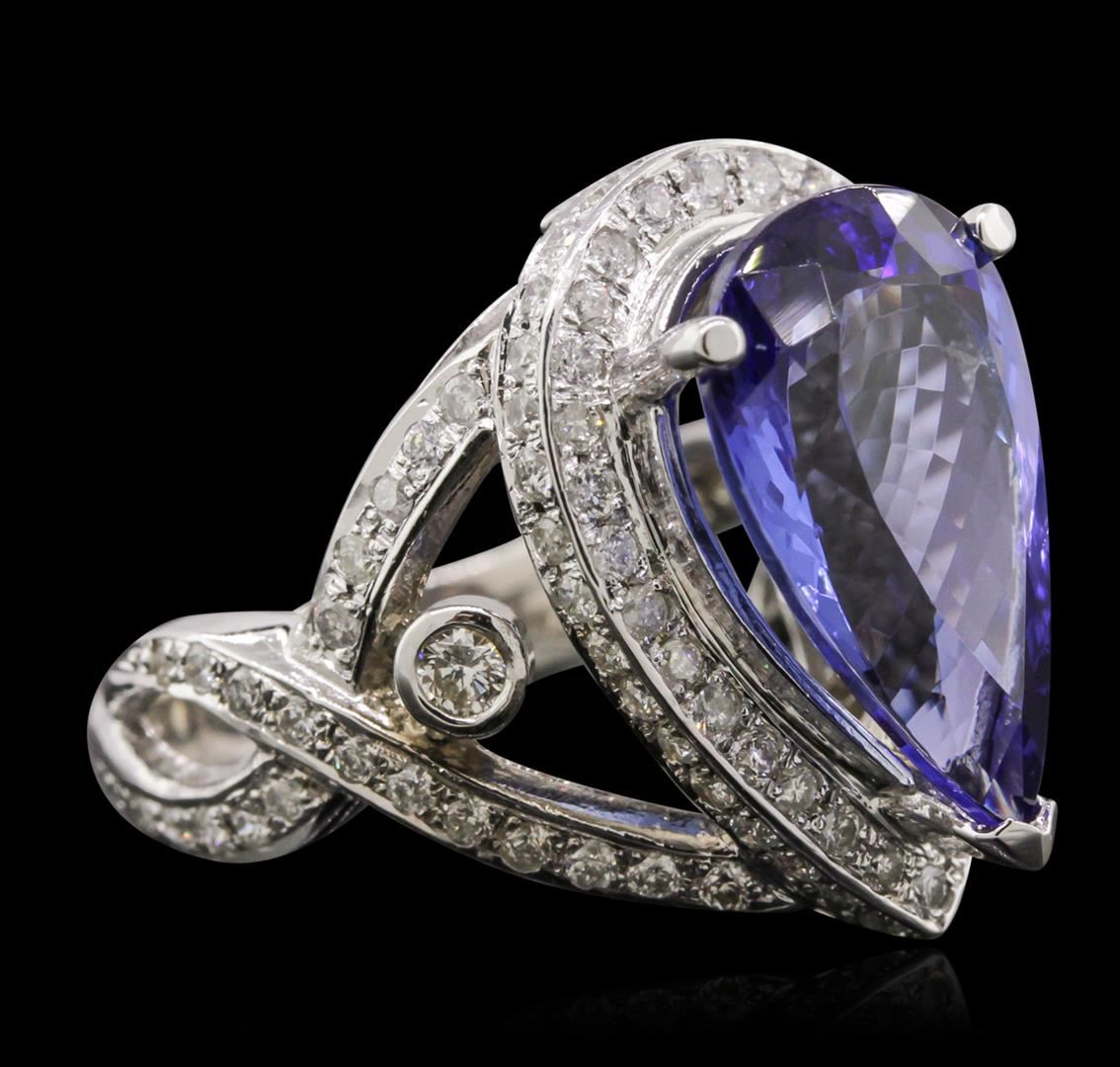 One electronically tested 14KT white gold ladies cast tanzanite and diamond ring with a bright polish finish. Condition is new, good workmanship. The featured tanzanite is set within a diamond bezel supported by stylized intertwining diamond set shoulders, completed by a three and one-half millimeter wide band. Identified with markings of "14K". Containing: One prong set pear modified brilliant cut natural tanzanite, measuring 16.89 x 10.60 x 6.37mm, exact weight 7.40ct., clarity is eye clean, type I, medium dark, moderately strong, bluish violet color, (GIA bV 6/4), cut is good. Transmitting light with no distortion, transparent. GIA Gemological Report attached. Graded loose prior to setting in the GIA Laboratory, Report #2161097881.Tanzanite is a very rare gemstone that is only found in the country of Tanzania. Originally discovered in 1967. Tiffany & Company, named the stone Tanzanite. It is found in the Usumburu Mountains that border the Umba Valley of northern Tanzania. Tanzanite occurs in gray, brown, violet, blue, reddish-purple, & green. The gem is interesting because of its exceptional pleochroism. Rotated in different directions a tanzanite will exhibit multiple changes of color. Tanzanite has a low tolerance to ultrasonic cleaning, and should not be cleaned using this method. Two bezel set round brilliant cut diamonds, measuring 2.50 - 2.50 x 1.50mm (depth est.) approximate. Total Weight of 2 Stones = 0.15ct. Graded in the setting. Clarity: SI-2 to I-1. Color: H - I One Hundred Thirty prong and bezel set round brilliant cut diamonds, measuring 1.50 - 1.40 x 0.87mm (depth est.) approximate. Total Weight of 130 Stones = 1.54ct. Graded in the setting. Clarity: SI-2 to I-2. Color: G - I. Total Weight of Colored Stones 7.40ct. Total Weight of Diamonds 1.69ct. Total Weight of Ring 10.49 grams. AIG Appraised at $25,160.00.