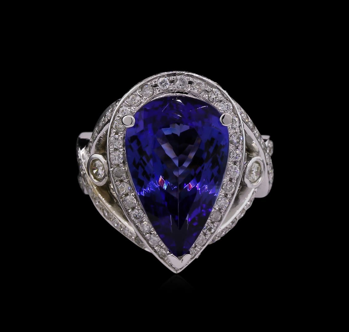 One electronically tested 14KT white gold ladies cast tanzanite and diamond ring with a bright polish finish. Condition is new, good workmanship. The featured tanzanite is set within a diamond bezel supported by stylized intertwining diamond set shoulders, completed by a three and one-half millimeter wide band. Identified with markings of "14K". Containing: One prong set pear modified brilliant cut natural tanzanite, measuring 16.89 x 10.60 x 6.37mm, exact weight 7.40ct., clarity is eye clean, type I, medium dark, moderately strong, bluish violet color, (GIA bV 6/4), cut is good. Transmitting light with no distortion, transparent. GIA Gemological Report attached. Graded loose prior to setting in the GIA Laboratory, Report #2161097881.Tanzanite is a very rare gemstone that is only found in the country of Tanzania. Originally discovered in 1967. Tiffany & Company, named the stone Tanzanite. It is found in the Usumburu Mountains that border the Umba Valley of northern Tanzania. Tanzanite occurs in gray, brown, violet, blue, reddish-purple, & green. The gem is interesting because of its exceptional pleochroism. Rotated in different directions a tanzanite will exhibit multiple changes of color. Tanzanite has a low tolerance to ultrasonic cleaning, and should not be cleaned using this method. Two bezel set round brilliant cut diamonds, measuring 2.50 - 2.50 x 1.50mm (depth est.) approximate. Total Weight of 2 Stones = 0.15ct. Graded in the setting. Clarity: SI-2 to I-1. Color: H - I One Hundred Thirty prong and bezel set round brilliant cut diamonds, measuring 1.50 - 1.40 x 0.87mm (depth est.) approximate. Total Weight of 130 Stones = 1.54ct. Graded in the setting. Clarity: SI-2 to I-2. Color: G - I. Total Weight of Colored Stones 7.40ct. Total Weight of Diamonds 1.69ct. Total Weight of Ring 10.49 grams. AIG Appraised at $25,160.00.