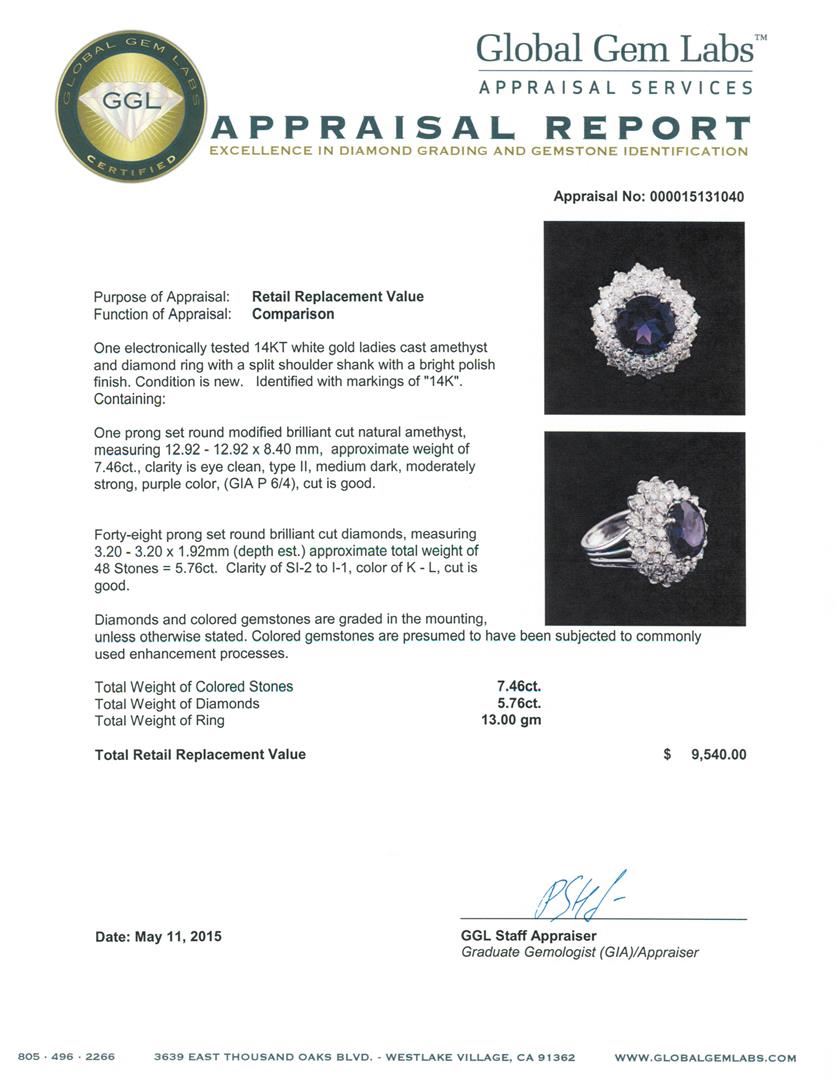 One electronically tested 14KT white gold ladies cast amethyst and diamond ring with a split shoulder shank with a bright polish finish. Identified with markings of "14K". Condition is new. Containing: One prong set round modified brilliant cut natural am GGL Appraised at $9,540.00.