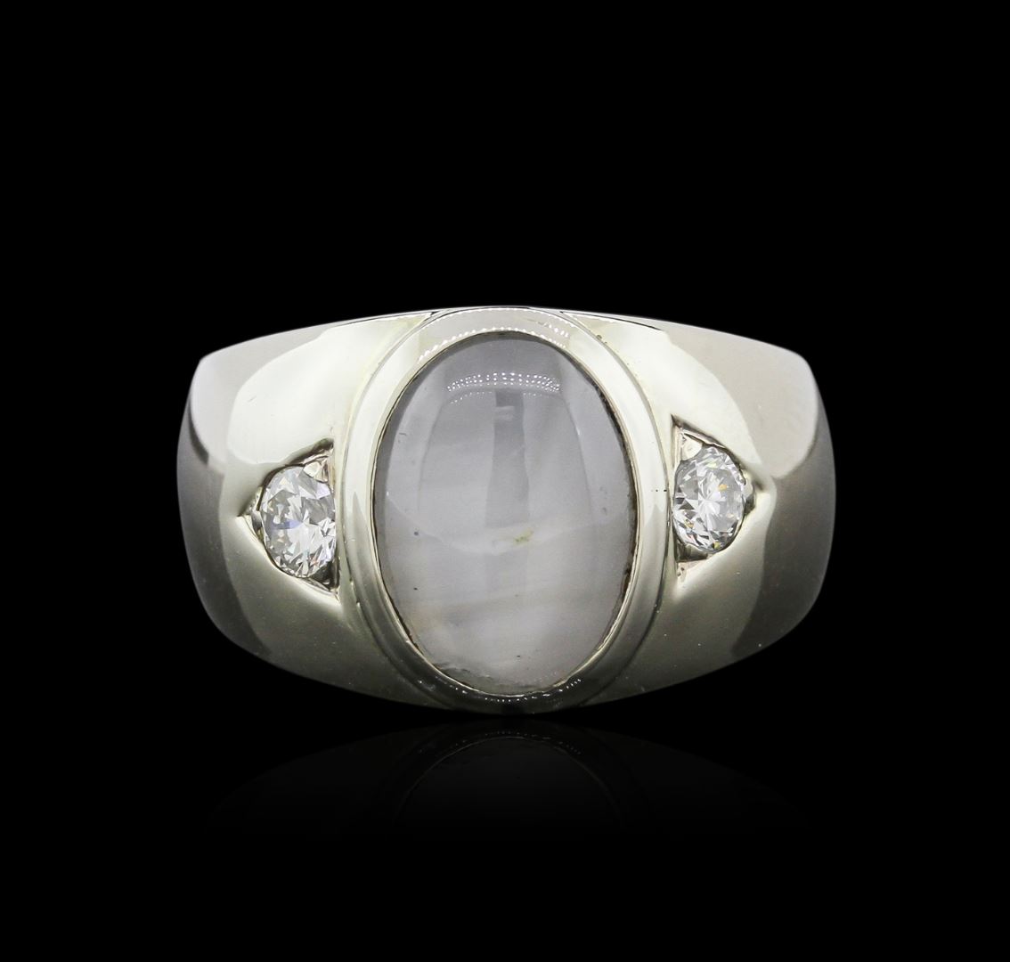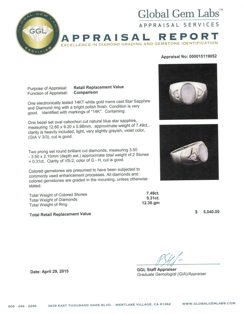 One electronically tested 14KT white gold mens cast Star Sapphire and Diamond ring with a bright polish finish. Identified with markings of "14K". Condition is very good. Containing: One bezel set oval cabochon cut natural blue star sapphire, measuring 12.60 x 9.20 x 5.98mm, approximate weight of 7.49ct., clarity is heavily included, light, very slightly grayish, violet color, (GIA V 3/3), cut is good. Two prong set round brilliant cut diamonds, measuring 3.50 - 3.50 x 2.10mm (depth est.) approximate total weight of 2 Stones = 0.31ct. Clarity: VS-2. Color: G - H, Cut is Good. Colored gemstones are presumed to have been subjected to commonly used enhancement processes. All diamonds and colored gemstones are graded in the mounting, unless otherwise stated. Total Weight of Colored Stones 7.49ct. Total Weight of Diamonds 0.31ct. Total Weight of Ring 12.30 grams. GGL Appraised at $5,040.00.