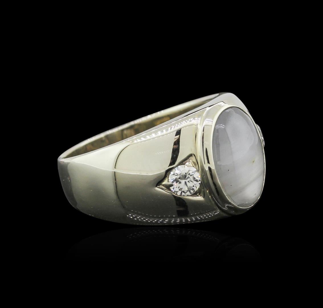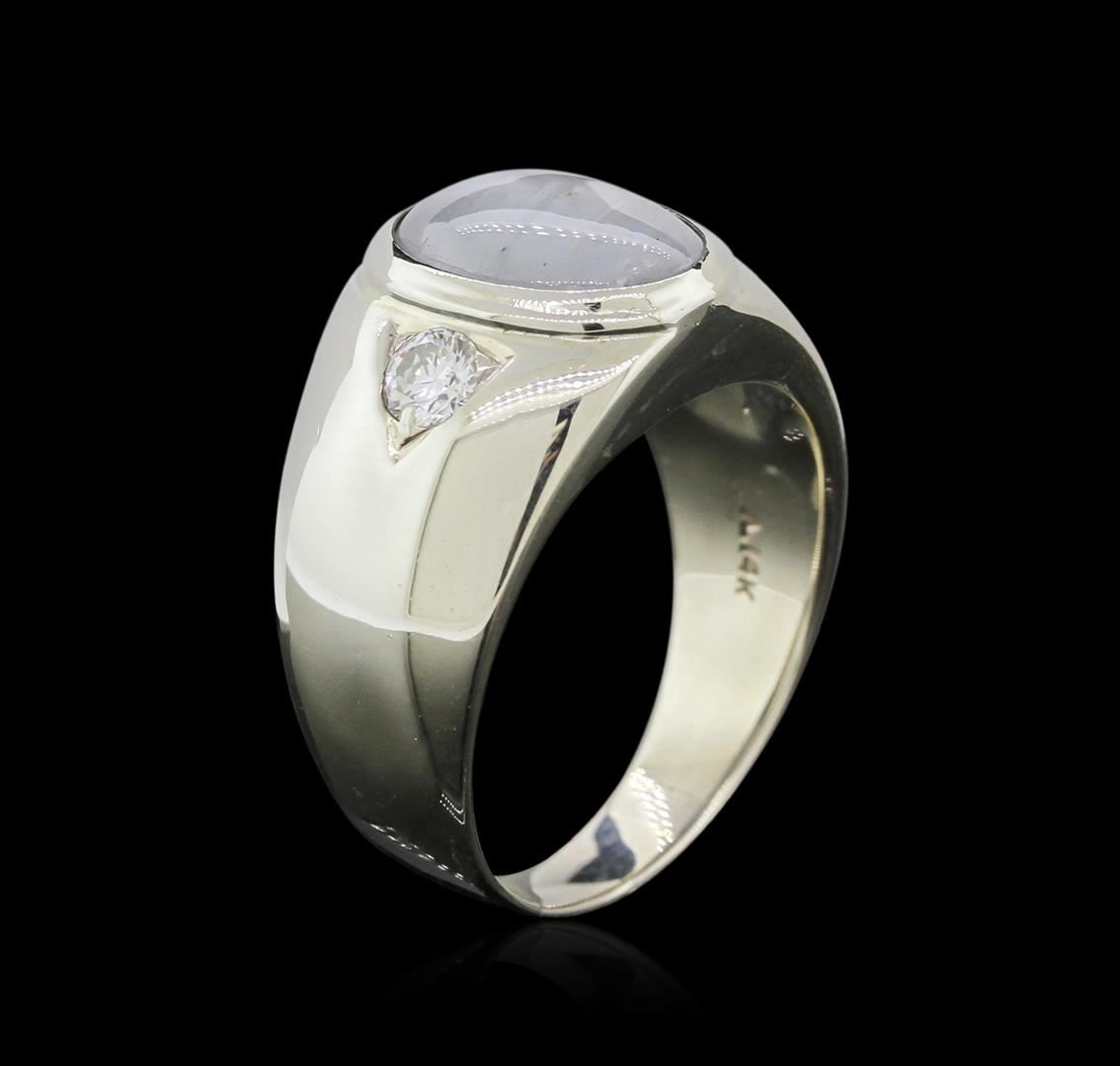 One electronically tested 14KT white gold mens cast Star Sapphire and Diamond ring with a bright polish finish. Identified with markings of "14K". Condition is very good. Containing: One bezel set oval cabochon cut natural blue star sapphire, measuring 12.60 x 9.20 x 5.98mm, approximate weight of 7.49ct., clarity is heavily included, light, very slightly grayish, violet color, (GIA V 3/3), cut is good. Two prong set round brilliant cut diamonds, measuring 3.50 - 3.50 x 2.10mm (depth est.) approximate total weight of 2 Stones = 0.31ct. Clarity: VS-2. Color: G - H, Cut is Good. Colored gemstones are presumed to have been subjected to commonly used enhancement processes. All diamonds and colored gemstones are graded in the mounting, unless otherwise stated. Total Weight of Colored Stones 7.49ct. Total Weight of Diamonds 0.31ct. Total Weight of Ring 12.30 grams. GGL Appraised at $5,040.00.