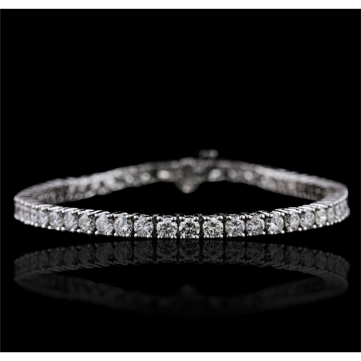 One electronically tested 14KT white gold ladies cast & assembled diamond tennis bracelet with a bright polish finish. Seven and one-half inch length bracelet composed of a flexible ribbon of diamonds, terminating in a concealed clasp with safety bar. Identified with markings of "14K". Condition is new, good workmanship. Tennis bracelets & necklaces got their unusual name from an incident involving the U.S. professional tennis player Chris Evert during a tennis match in the 1980's. Evert had been wearing an expensive diamond bracelet, an inline string of individually-set diamonds. Previously these bracelets were known as eternity bracelets. When the clasp snapped during play, she asked the officials to stop the tennis match until the bracelet could be found. Since that day, bracelets and necklaces featuring an inline string of diamonds have been called tennis bracelets and tennis necklaces. Containing: Fifty-Four prong set round brilliant cut diamonds, measuring 3.50 - 3.30 x 1.95mm (depth est.) approximate total weight of 54 Stones = 7.52ct. The color grade reflects the entire range of color for this group. Graded in the setting. Clarity: SI-1 to I-1 . Color: G - I. Total Weight of Diamonds 7.52ct. Total Weight of Tennis Bracelet 19.14 grams. AIG Appraised at $24,760.00.