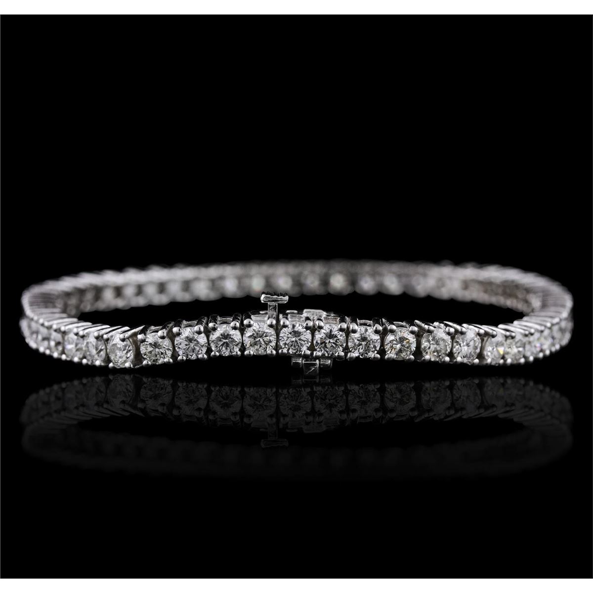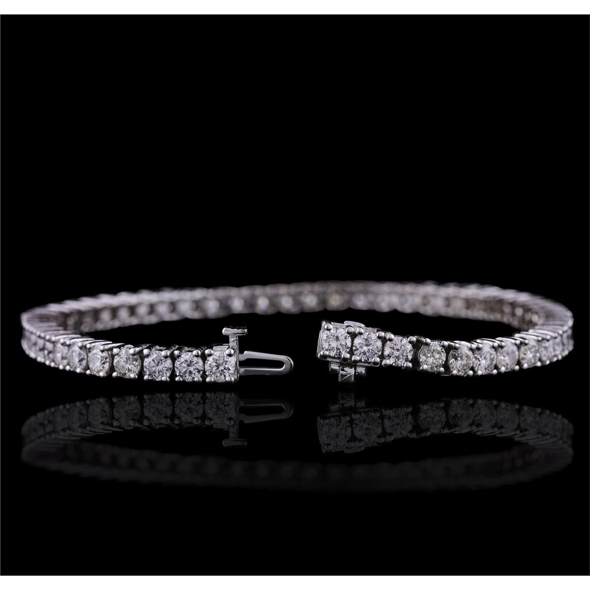 One electronically tested 14KT white gold ladies cast & assembled diamond tennis bracelet with a bright polish finish. Seven and one-half inch length bracelet composed of a flexible ribbon of diamonds, terminating in a concealed clasp with safety bar. Identified with markings of "14K". Condition is new, good workmanship. Tennis bracelets & necklaces got their unusual name from an incident involving the U.S. professional tennis player Chris Evert during a tennis match in the 1980's. Evert had been wearing an expensive diamond bracelet, an inline string of individually-set diamonds. Previously these bracelets were known as eternity bracelets. When the clasp snapped during play, she asked the officials to stop the tennis match until the bracelet could be found. Since that day, bracelets and necklaces featuring an inline string of diamonds have been called tennis bracelets and tennis necklaces. Containing: Fifty-Four prong set round brilliant cut diamonds, measuring 3.50 - 3.30 x 1.95mm (depth est.) approximate total weight of 54 Stones = 7.52ct. The color grade reflects the entire range of color for this group. Graded in the setting. Clarity: SI-1 to I-1 . Color: G - I. Total Weight of Diamonds 7.52ct. Total Weight of Tennis Bracelet 19.14 grams. AIG Appraised at $24,760.00.