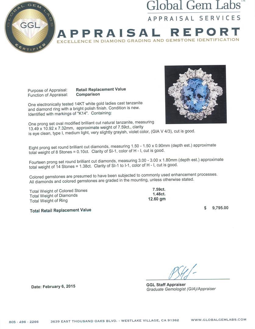 One electronically tested 14KT white gold ladies cast tanzanite and diamond ring with a bright polish finish. Identified with markings of "K14". Condition is new. Containing: One prong set oval modified brilliant cut natural tanzanite, measuring 13.49 x 10.92 x 7.32mm, approximate weight of 7.59ct., clarity is eye clean, type I, medium light, very slightly grayish, violet color, (GIA V 4/3), cut is good. Eight prong set round brilliant cut diamonds, measuring 1.50 - 1.50 x 0.90mm (depth est.) approximate. Total Weight of 8 Stones = 0.10ct. Clarity: SI-1. Color: H - I, Cut is Good. Fourteen prong set round brilliant cut diamonds, measuring 3.00 - 3.00 x 1.80mm (depth est.) approximate. Total Weight of 14 Stones = 1.38ct. Clarity: SI-1 to I-1. Color: H - I, Cut is Good. Colored gemstones are presumed to have been subjected to commonly used enhancement processes. All diamonds and colored gemstones are graded in the mounting, unless otherwise stated. Total Weight of Colored Stones 7.59ct. Total Weight of Diamonds 1.48ct. Total Weight of Ring 12.60 grams. GGL Appraised at $9,795.00.