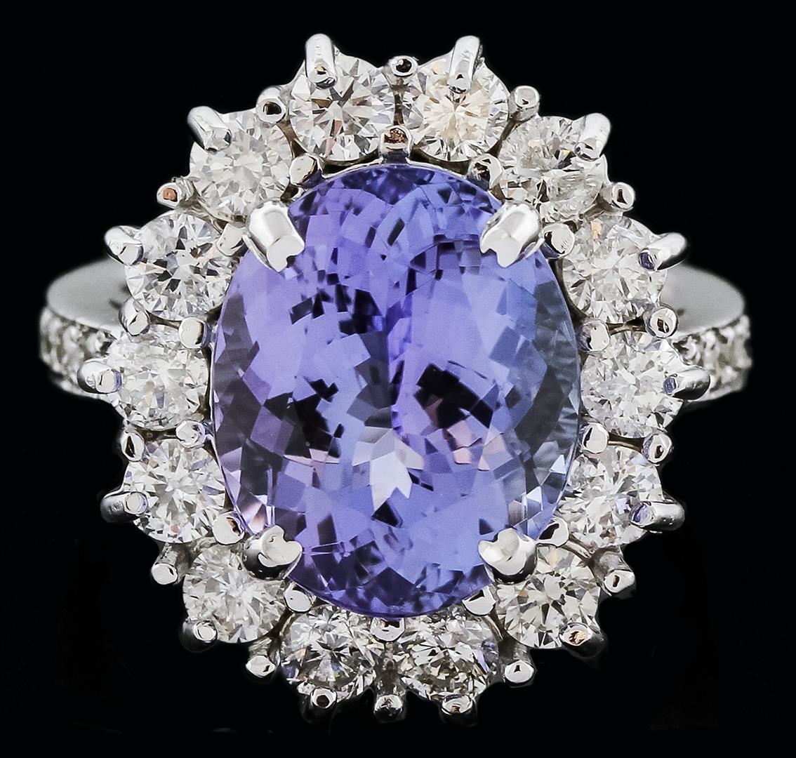 One electronically tested 14KT white gold ladies cast tanzanite and diamond ring with a bright polish finish. Identified with markings of "K14". Condition is new. Containing: One prong set oval modified brilliant cut natural tanzanite, measuring 13.49 x 10.92 x 7.32mm, approximate weight of 7.59ct., clarity is eye clean, type I, medium light, very slightly grayish, violet color, (GIA V 4/3), cut is good. Eight prong set round brilliant cut diamonds, measuring 1.50 - 1.50 x 0.90mm (depth est.) approximate. Total Weight of 8 Stones = 0.10ct. Clarity: SI-1. Color: H - I, Cut is Good. Fourteen prong set round brilliant cut diamonds, measuring 3.00 - 3.00 x 1.80mm (depth est.) approximate. Total Weight of 14 Stones = 1.38ct. Clarity: SI-1 to I-1. Color: H - I, Cut is Good. Colored gemstones are presumed to have been subjected to commonly used enhancement processes. All diamonds and colored gemstones are graded in the mounting, unless otherwise stated. Total Weight of Colored Stones 7.59ct. Total Weight of Diamonds 1.48ct. Total Weight of Ring 12.60 grams. GGL Appraised at $9,795.00.