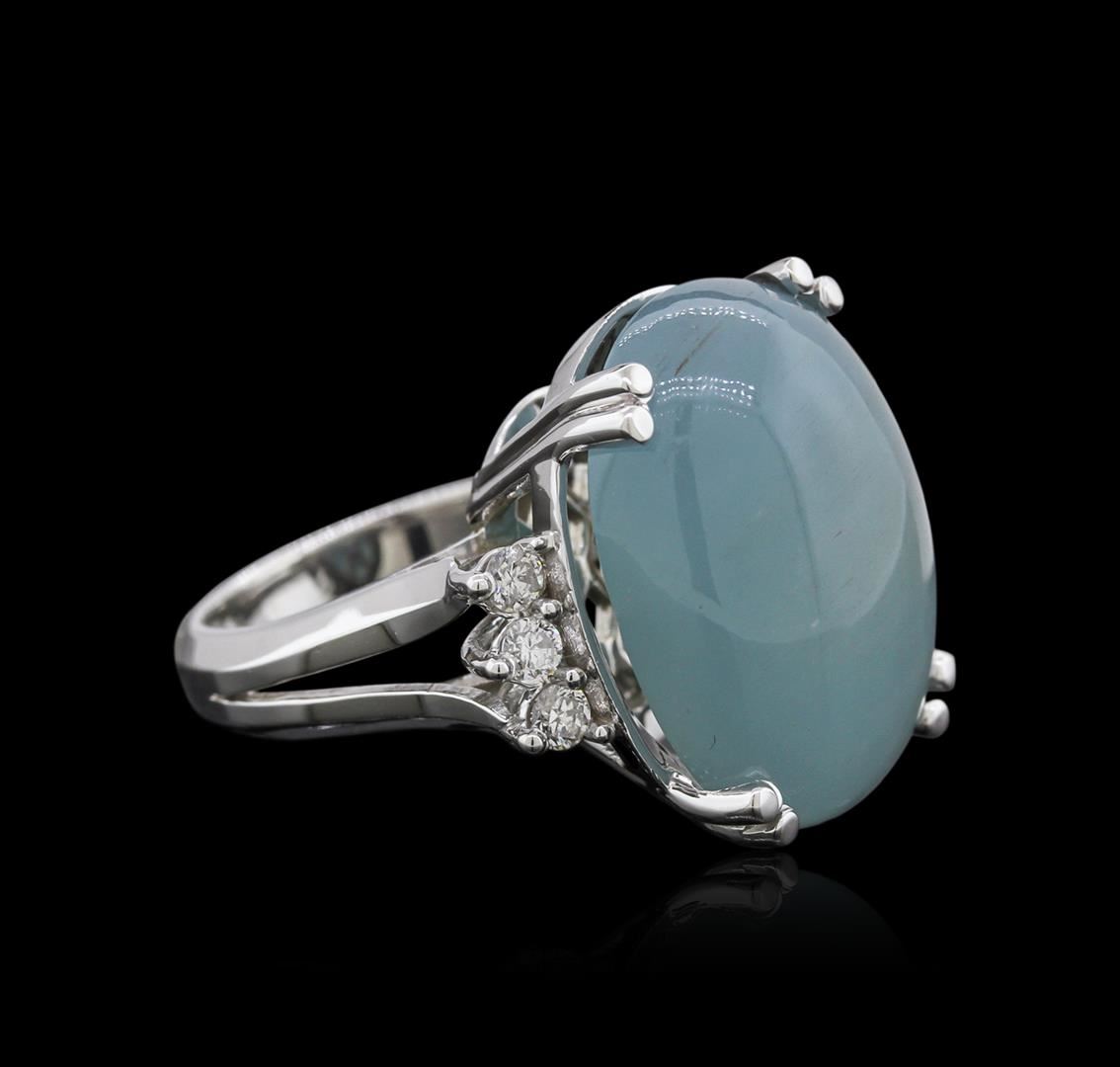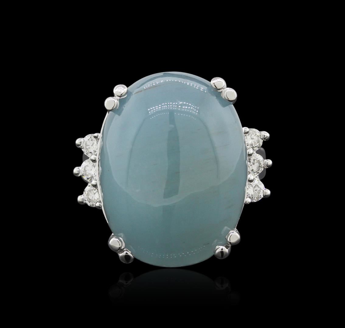 One electronically tested 14KT white gold ladies cast aquamarine and diamond ring with a bright polish finish. Identified with markings of "14K". Condition is new. Containing: One prong set oval cabochon cut natural aquamarine, measuring 22.20 x 16.70 x 10.86mm, approximate weight of 7.60ct., clarity is severely included, type I, medium light, very slightly grayish, blue color, (GIA B 4/3), cut is good. Six prong set round brilliant cut diamonds, measuring 2.50 - 2.50 x 1.50mm (depth est.) approximate total weight of 6 Stones = 0.45ct. Clarity: SI-1 to SI-2. Color: I - J, Cut is Good. Colored gemstones are presumed to have been subjected to commonly used enhancement processes. All diamonds and colored gemstones are graded in the mounting, unless otherwise stated. Total Weight of Colored Stones 7.60ct. Total Weight of Diamonds 0.45ct. Total Weight of Ring 14.90 grams. GGL Appraised at $3,425.00.