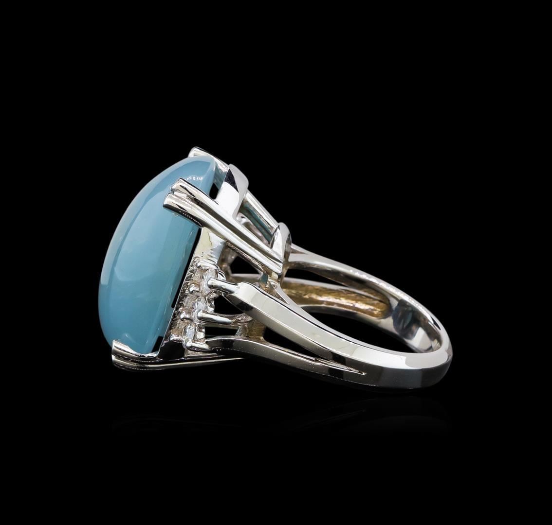 One electronically tested 14KT white gold ladies cast aquamarine and diamond ring with a bright polish finish. Identified with markings of "14K". Condition is new. Containing: One prong set oval cabochon cut natural aquamarine, measuring 22.20 x 16.70 x 10.86mm, approximate weight of 7.60 ct., clarity is severely included, type I, medium light, very slightly grayish, blue color, (GIA B 4/3), cut is good. Six prong set round brilliant cut diamonds, measuring 2.50 - 2.50 x 1.50mm (depth est.) approximate total weight of 6 Stones = 0.45ct. Clarity: SI-1 to SI-2. Color: I - J, Cut is Good. Colored gemstones are presumed to have been subjected to commonly used enhancement processes. All diamonds and colored gemstones are graded in the mounting, unless otherwise stated. Total Weight of Colored Stones 7.60 ct. Total Weight of Diamonds 0.45ct. Total Weight of Ring 14.90 grams. GGL Appraised.