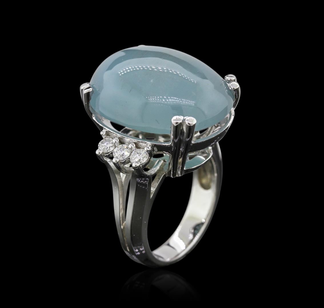 One electronically tested 14KT white gold ladies cast aquamarine and diamond ring with a bright polish finish. Identified with markings of "14K". Condition is new. Containing: One prong set oval cabochon cut natural aquamarine, measuring 22.20 x 16.70 x 10.86mm, approximate weight of 7.60ct., clarity is severely included, type I, medium light, very slightly grayish, blue color, (GIA B 4/3), cut is good. Six prong set round brilliant cut diamonds, measuring 2.50 - 2.50 x 1.50mm (depth est.) approximate total weight of 6 Stones = 0.45ct. Clarity: SI-1 to SI-2. Color: I - J, Cut is Good. Colored gemstones are presumed to have been subjected to commonly used enhancement processes. All diamonds and colored gemstones are graded in the mounting, unless otherwise stated. Total Weight of Colored Stones 7.60ct. Total Weight of Diamonds 0.45ct. Total Weight of Ring 14.90 grams. GGL Appraised at $3,425.00.