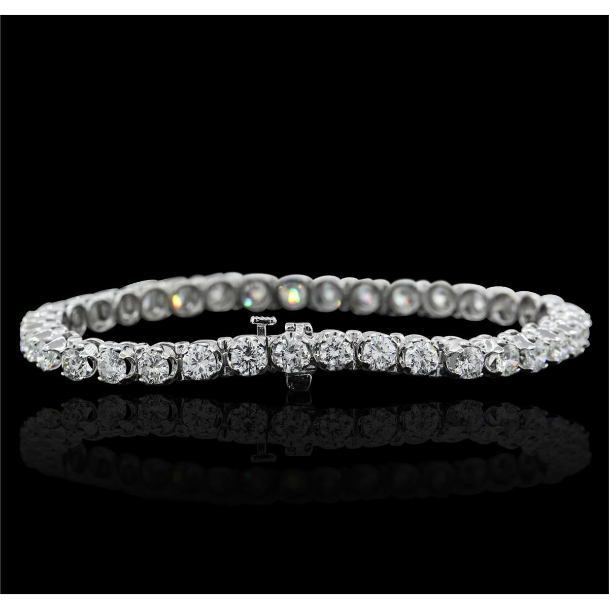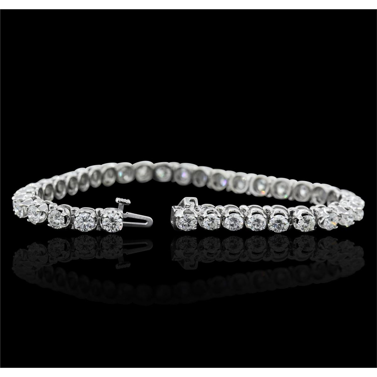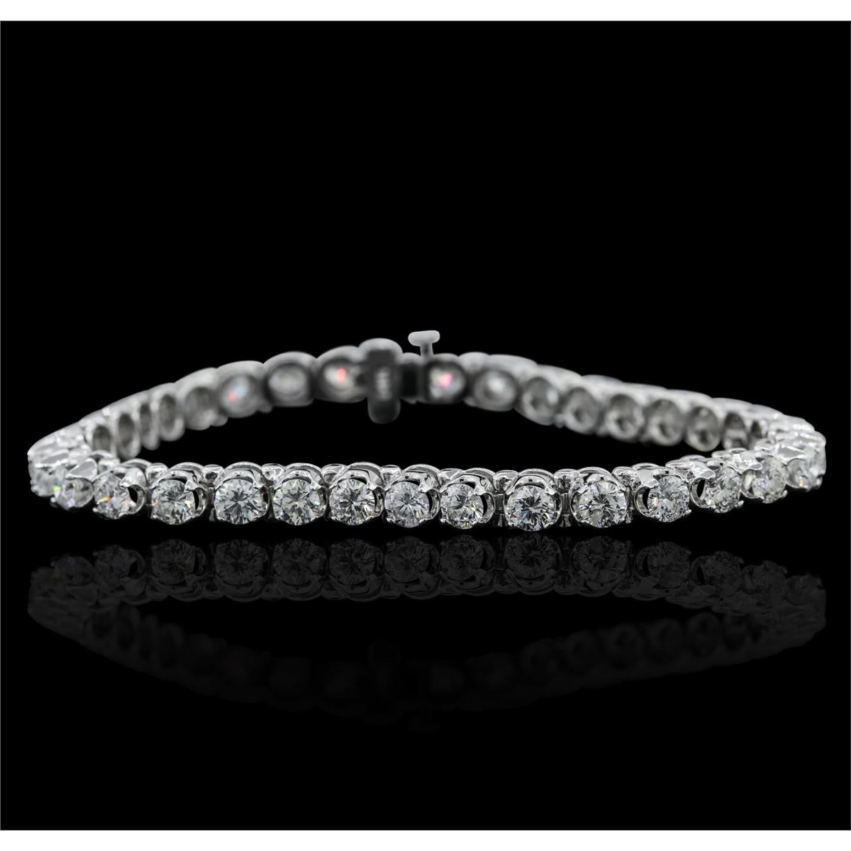 One electronically tested 14KT white gold ladies combination cast & assembled tennis bracelet with a hidden box clasp with a bright polish finish. Condition is new. Measurements: 7" in length. Identified with markings of "14K". Containing: Thirty-Five prong set round brilliant cut diamonds, measuring 3.90 - 3.90 x 2.34mm (depth est.) approximate total weight of 35 Stones = 7.60ct. Clarity: SI-1 to I-1. Color: H - J, Cut is Good. All diamonds are graded in the mounting, unless otherwise stated. Total Weight of Diamonds 7.60ct. Total Weight of Bracelet 16.10 grams. GGL Appraised at $32,335.00.
