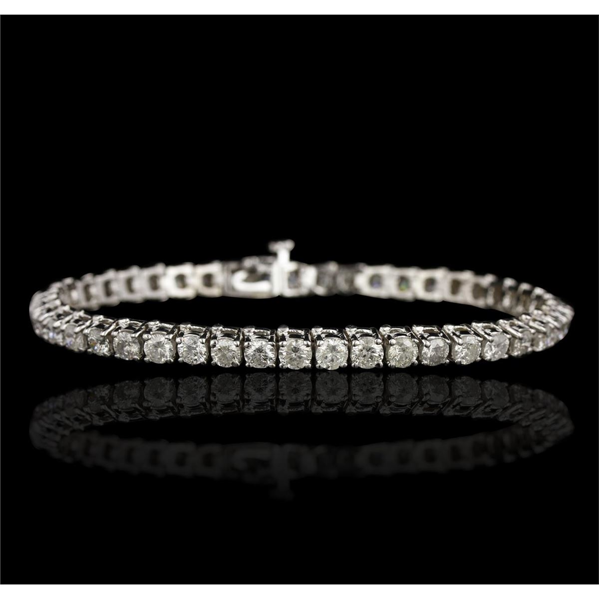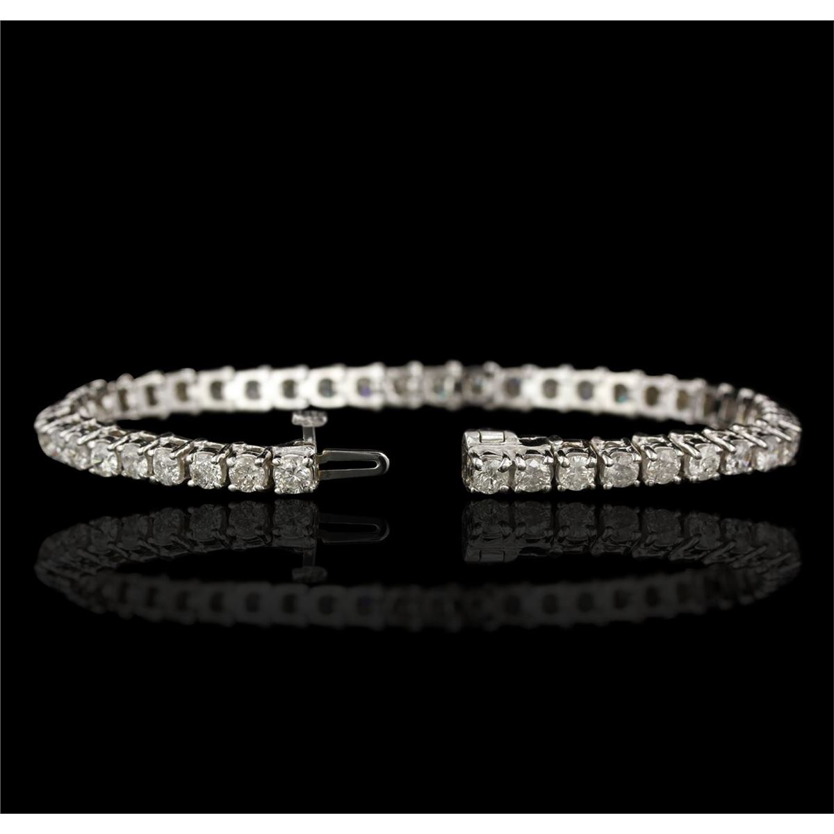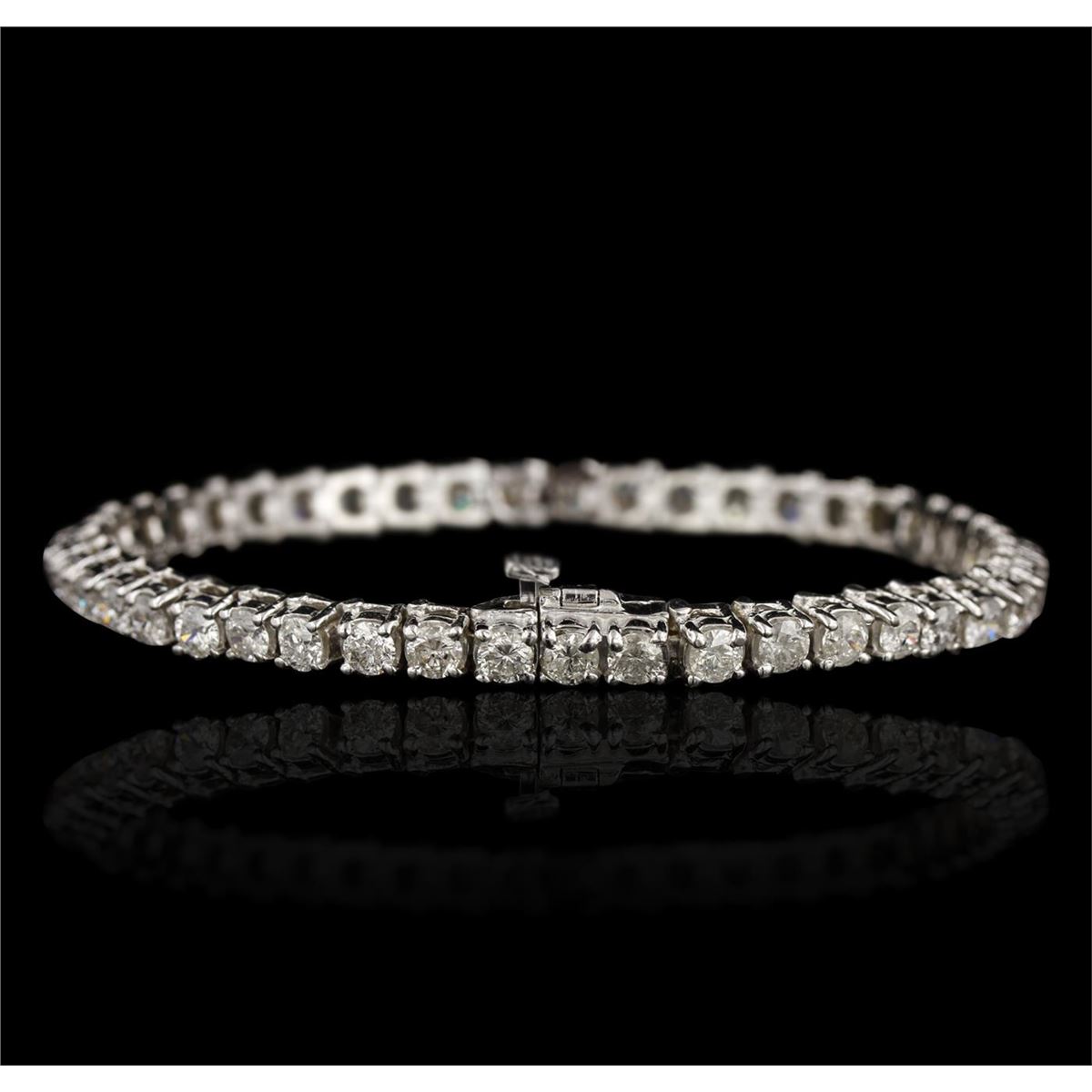 One electronically tested 14KT white gold ladies cast & assembled diamond tennis bracelet with a bright polish finish. Seven inch length bracelet composed of a flexible ribbon of diamonds, terminating in a concealed clasp with safety. Identified with markings of "14K". Condition is good. Tennis bracelets got their unusual name from an incident involving the U.S. professional tennis player Chris Evert during a tennis match in the 1980's. Evert had been wearing an expensive diamond bracelet, an inline string of individually-set diamonds. Previously these bracelets were known as eternity bracelets. When the clasp snapped during play, she asked the officials to stop the tennis match until the bracelet could be found. Since that day, bracelets featuring an inline string of diamonds have been called tennis bracelets. Containing: Forty-five prong set round brilliant cut diamonds, measuring 3.50 - 3.30 x 2.04mm (depth est.) approximate total weight of 45 Stones = 7.60ct. Graded in the setting. Clarity I-1 to 1-2. Color H -- J. Total Weight of Diamonds 7.60ct. Total Weight of Tennis Bracelet 17.20gm. AIG Appraised at $19,700.00.