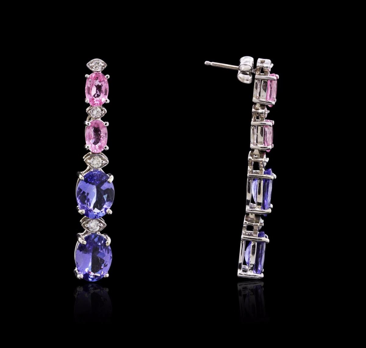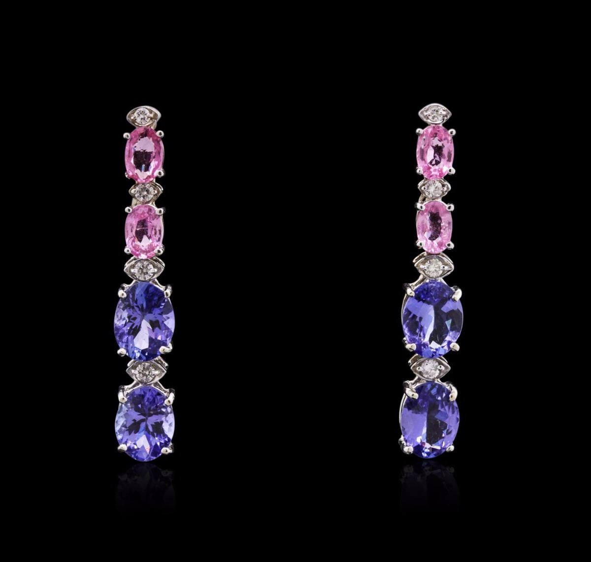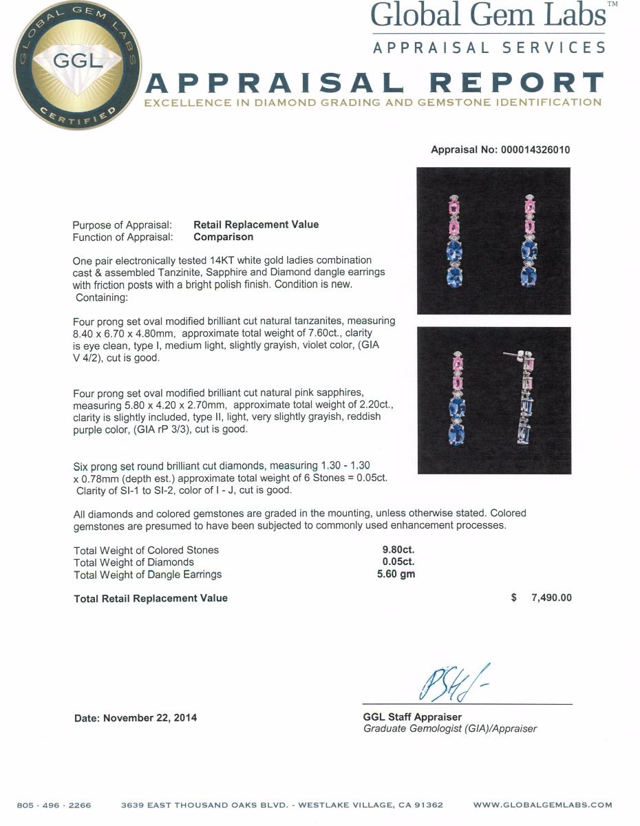One pair electronically tested 14KT white gold ladies combination cast & assembled Tanzinite, Sapphire and Diamond dangle earrings with friction posts with a bright polish finish. Condition is new. Containing: Four prong set oval modified brilliant cut natural tanzanites, measuring 8.40 x 6.70 x 4.80mm, approximate total weight of 7.60ct., clarity is eye clean, type I, medium light, slightly grayish, violet color, (GIA V 4/2), cut is good. Four prong set oval modified brilliant cut natural pink sapphires, measuring 5.80 x 4.20 x 2.70mm, approximate total weight of 2.20ct., clarity is slightly included, type II, light, very slightly grayish, reddish purple color, (GIA rP 3/3), cut is good. Six prong set round brilliant cut diamonds, measuring 1.30 - 1.30 x 0.78mm (depth est.) approximate total weight of 6 Stones = 0.05ct. Clarity: SI-1 to SI-2. Color: I - J, Cut is Good. All diamonds and colored gemstones are graded in the mounting, unless otherwise stated. Colored gemstones are presumed to have been subjected to commonly used enhancement processes. Total Weight of Colored Stones 9.80ct. Total Weight of Diamonds 0.05ct. Total Weight of Dangle Earrings 5.60 grams. GGL Appraised at $7,490.00.