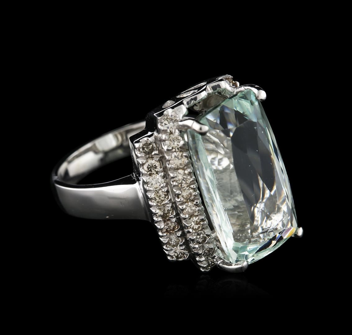 One electronically tested 14KT white gold ladies cast aquamarine and diamond ring with a bright polish finish. Identified with markings of "14K". Condition is new. Containing: One prong set rectangular cushion modified brilliant cut natural aquamarine, measuring 17.00 x 10.00 x 7.00mm, approximate weight of 7.61ct., clarity is eye clean, type I, light, slightly grayish, blue color, (GIA B 3/2), cut is good. Thirty-Six prong set round brilliant cut diamonds, measuring 1.60 - 1.60 x 0.96mm (depth est.) approximate total weight of 36 Stones = 0.54ct. Clarity: SI-1 to I-1. Color: J - K, Cut is Good. All diamonds and colored gemstones are graded in the mounting, unless otherwise stated. Colored gemstones are presumed to have been subjected to commonly used enhancement processes. Total Weight of Colored Stones 7.61ct. Total Weight of Diamonds 0.54ct. Total Weight of Ring 10.20 grams. GGL Appraised at $4,365.00.