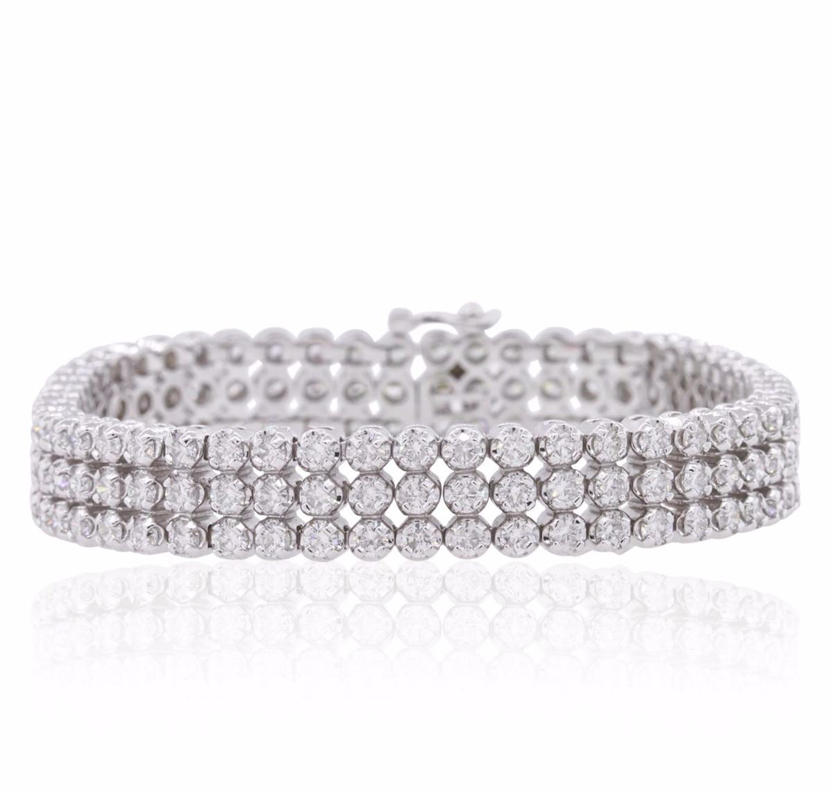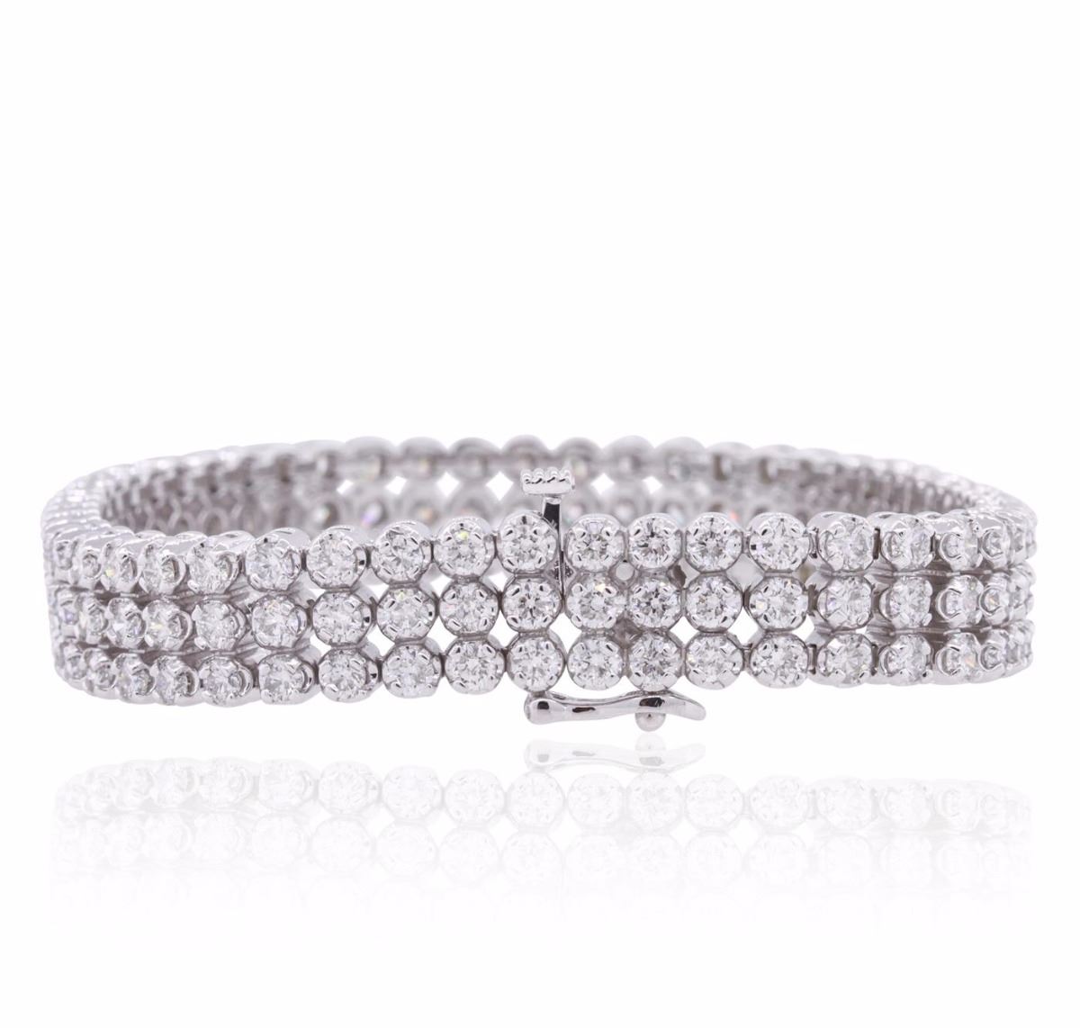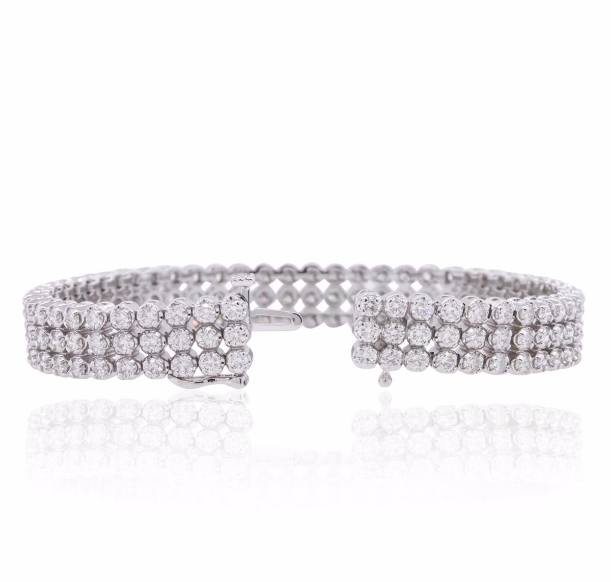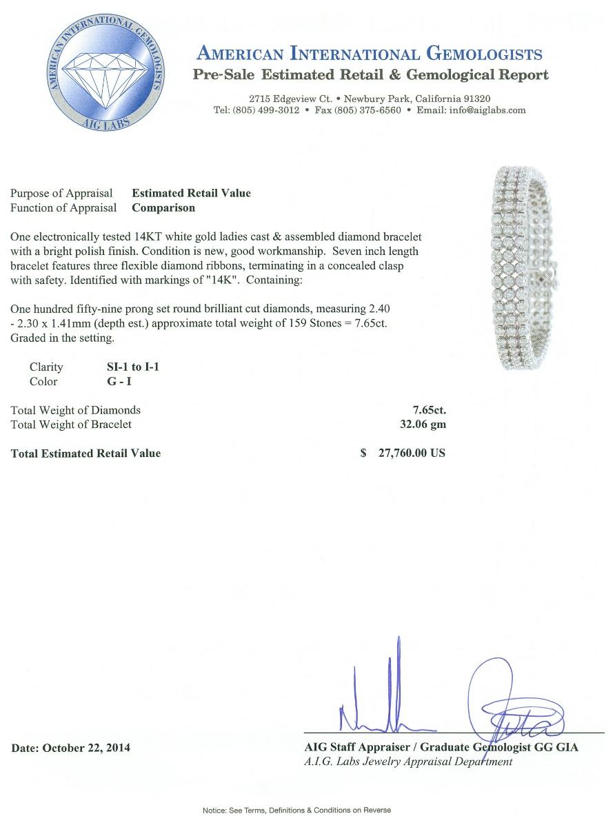 One electronically tested 14KT white gold ladies cast & assembled diamond bracelet with a bright polish finish. Seven inch length bracelet features three flexible diamond ribbons, terminating in a concealed clasp with safety. Identified with markings of 14K. Condition is new, good workmanship. Containing: One Hundred Fifty-Nine prong set round brilliant cut diamonds, measuring 2.40 - 2.30 x 1.41mm (depth est.) approximate total weight of 159 Stones = 7.65ct. Graded in the setting. Clarity: SI-1 to I-1. Color: G - I. Total Weight of Diamonds 7.65ct. Total Weight of Bracelet 32.06 grams. AIG Appraised at $27,760.00.