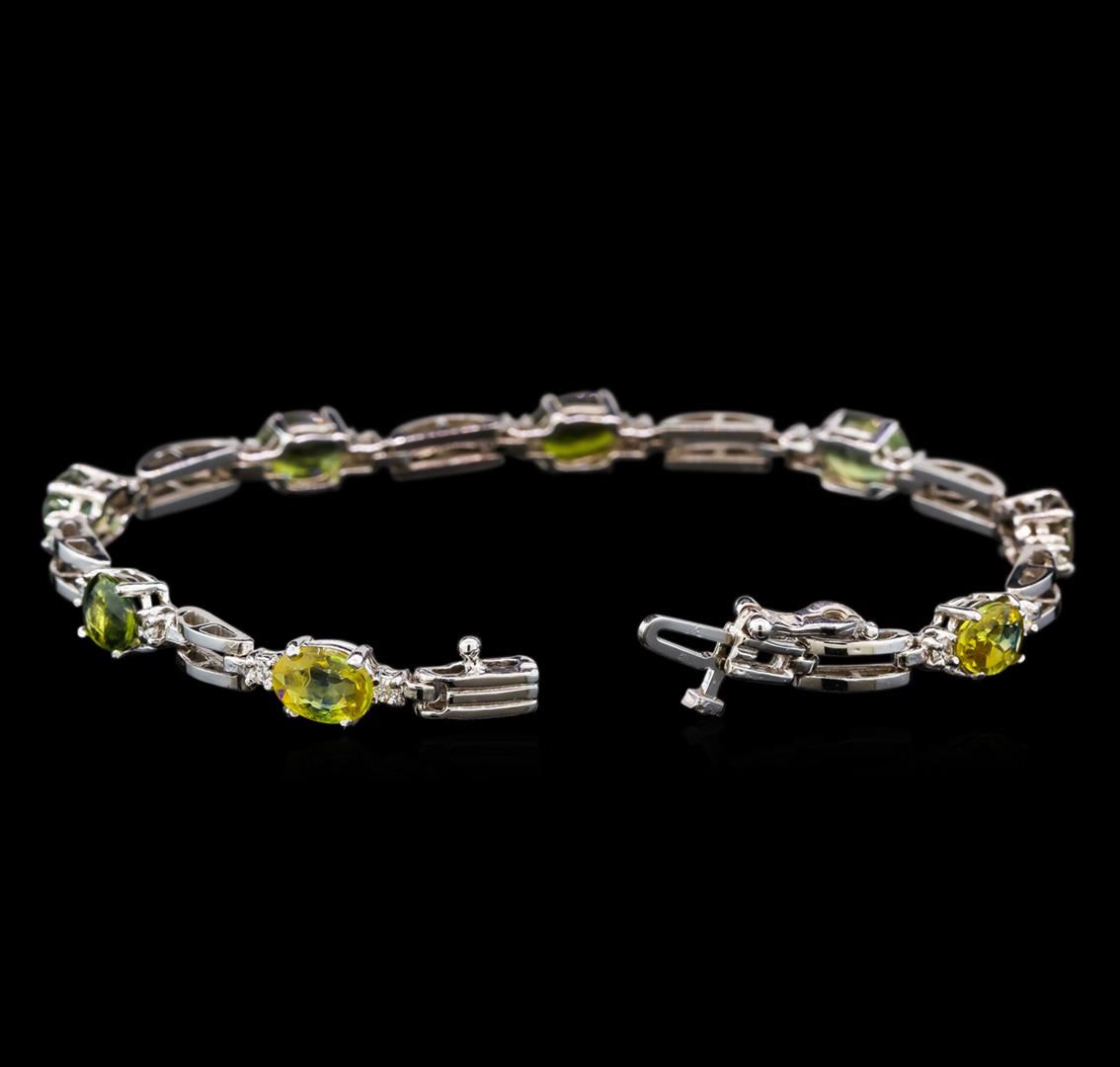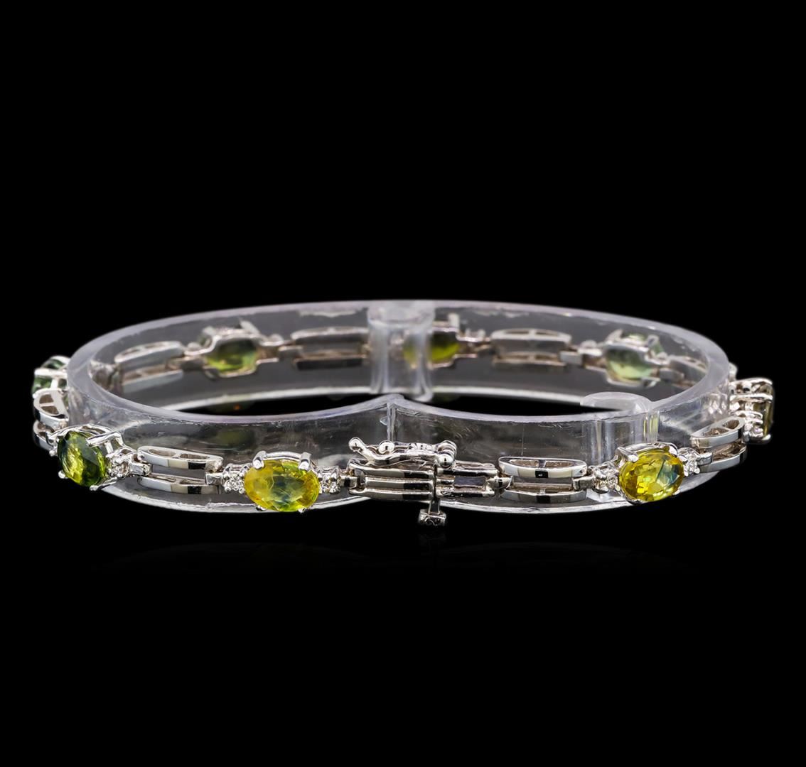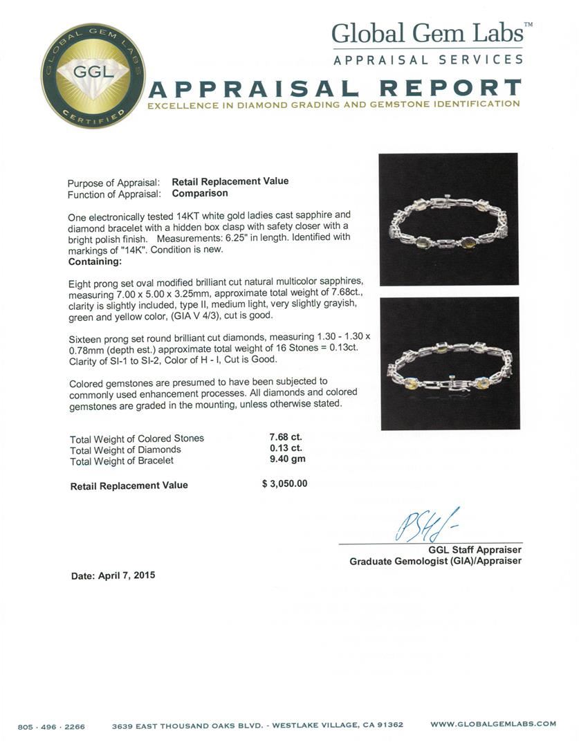 One electronically tested 14KT white gold ladies cast sapphire and diamond bracelet with a hidden box clasp with safety closer with a bright polish finish. Measurements: 6.25" in length. Identified with markings of "14K". Condition is new. Containing: Eight prong set oval modified brilliant cut natural multicolor sapphires, measuring 7.00. x 5.00. x 3.25mm, approximate total weight of 7.68ct., clarity is slightly included, type II, medium light, very slightly grayish, green and yellow color, (GIA V 4/3), cut is good. Sixteen prong set round brilliant cut diamonds, measuring 1.30 - 1.30 x 0.78mm (depth est.) approximate total weight of 16 Stones = 0.13ct. Clarity: SI-1 to SI-2. Color: H - I, Cut is Good. Colored gemstones are presumed to have been subjected to commonly used enhancement processes. All diamonds and colored gemstones are graded in the mounting, unless otherwise stated. Total Weight of Colored Stones 7.68ct. Total Weight of Diamonds 0.13ct. Total Weight of Bracelet 9.40 grams. GGL Appraised at $3,050.00.