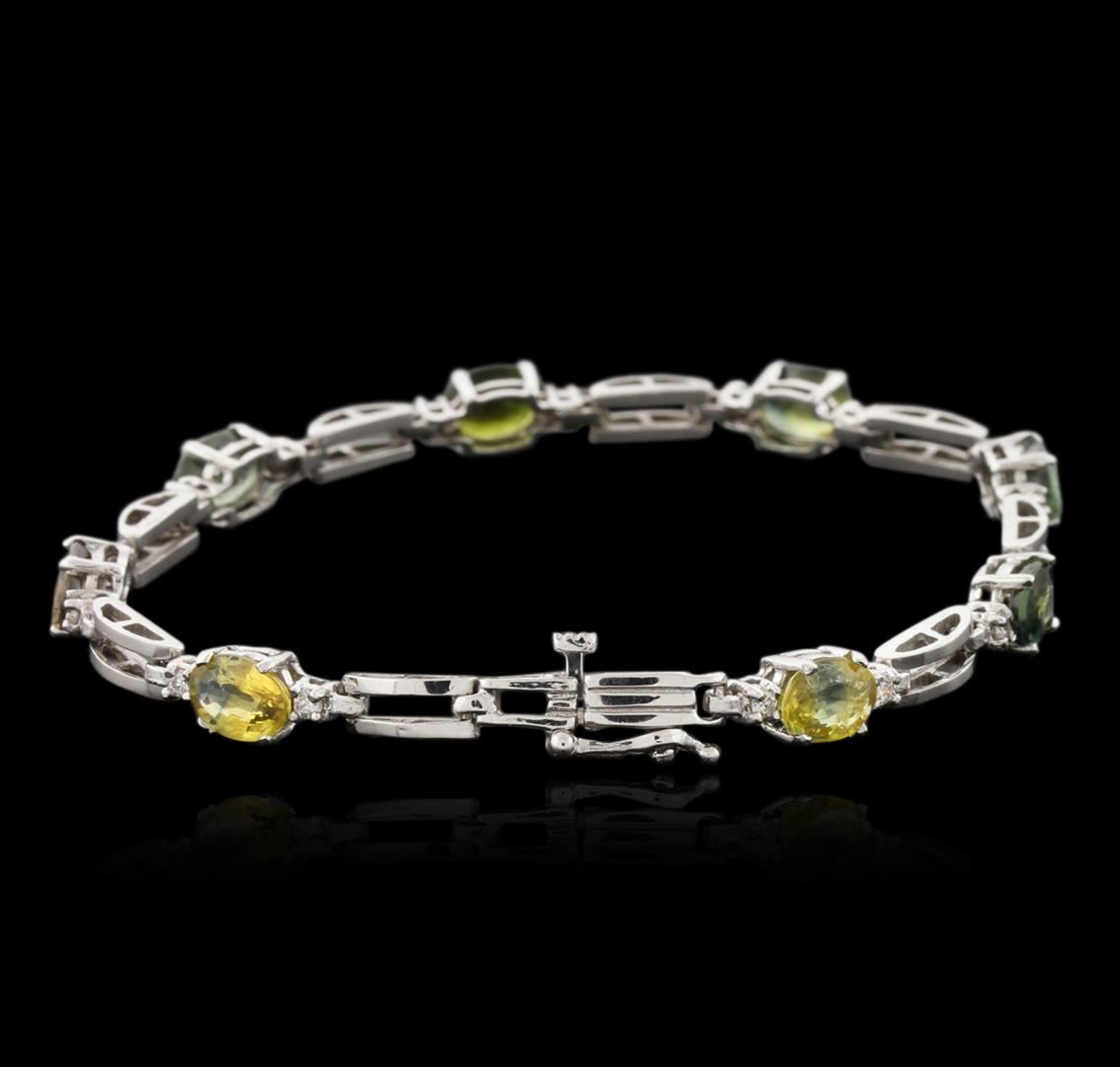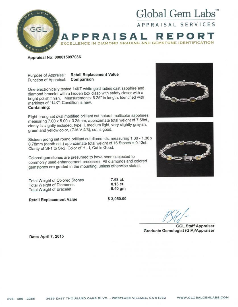 One electronically tested 14KT white gold ladies cast sapphire and diamond bracelet with a hidden box clasp with safety closer with a bright polish finish. Measurements: 6.25" in length. Identified with markings of "14K". Condition is new. Containing: Eight prong set oval modified brilliant cut natural multicolor sapphires, measuring 7.00. x 5.00. x 3.25mm, approximate total weight of 7.68ct., clarity is slightly included, type II, medium light, very slightly grayish, green and yellow color, (GIA V 4/3), cut is good. Sixteen prong set round brilliant cut diamonds, measuring 1.30 - 1.30 x 0.78mm (depth est.) approximate total weight of 16 Stones = 0.13ct. Clarity: SI-1 to SI-2. Color: H - I, Cut is Good. Colored gemstones are presumed to have been subjected to commonly used enhancement processes. All diamonds and colored gemstones are graded in the mounting, unless otherwise stated. Total Weight of Colored Stones 7.68ct. Total Weight of Diamonds 0.13ct. Total Weight of Bracelet 9.40 grams. GGL Appraised at $3,050.00.