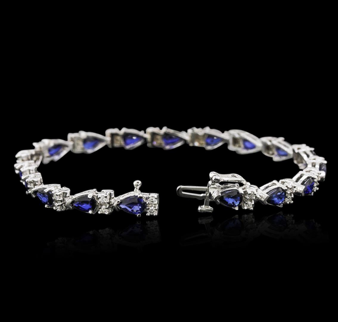 One electronically tested 14KT white gold ladies cast sapphire and diamond bracelet with a hidden box clasp with safety closer with a bright polish finish. Measurements: 7 " in length Identified with markings of "14K". Condition is new. Containing: Eighteen prong set pear modified brilliant cut natural blue sapphires, measuring 5.70 x 3.80 x 2.47mm, approximate total weight of 7.74ct., clarity is eye clean, type II, medium, moderately strong, blue color, (GIA B 5/4), cut is good. Thirty-Six prong set round brilliant cut diamonds, measuring 1.80 - 1.80 x 1.08mm (depth est.) approximate total weight of 36 Stones = 0.77ct. Clarity: SI-1 to SI-2. Color: I - J, Cut is Good. Colored gemstones are presumed to have been subjected to commonly used enhancement processes. All diamonds and colored gemstones are graded in the mounting, unless otherwise stated. Total Weight of Colored Stones 7.74ct. Total Weight of Diamonds 0.77ct. Total Weight of Bracelet 13.50 grams. GGL Appraised at $4,505.00.