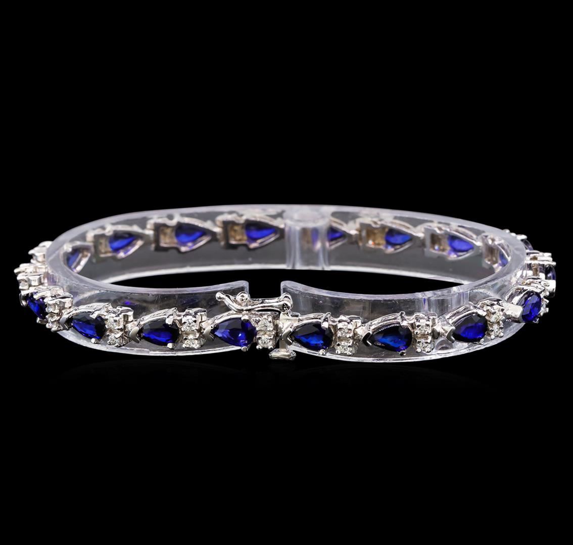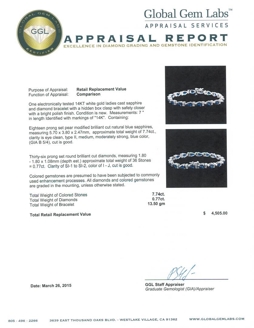 One electronically tested 14KT white gold ladies cast sapphire and diamond bracelet with a hidden box clasp with safety closer with a bright polish finish. Measurements: 7 " in length Identified with markings of "14K". Condition is new. Containing: Eighteen prong set pear modified brilliant cut natural blue sapphires, measuring 5.70 x 3.80 x 2.47mm, approximate total weight of 7.74ct., clarity is eye clean, type II, medium, moderately strong, blue color, (GIA B 5/4), cut is good. Thirty-Six prong set round brilliant cut diamonds, measuring 1.80 - 1.80 x 1.08mm (depth est.) approximate total weight of 36 Stones = 0.77ct. Clarity: SI-1 to SI-2. Color: I - J, Cut is Good. Colored gemstones are presumed to have been subjected to commonly used enhancement processes. All diamonds and colored gemstones are graded in the mounting, unless otherwise stated. Total Weight of Colored Stones 7.74ct. Total Weight of Diamonds 0.77ct. Total Weight of Bracelet 13.50 grams. GGL Appraised at $4,505.00.