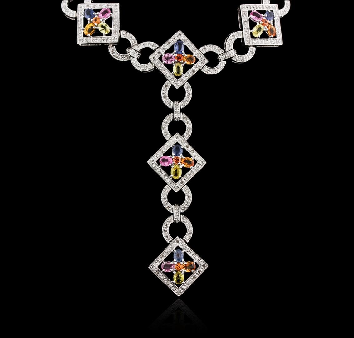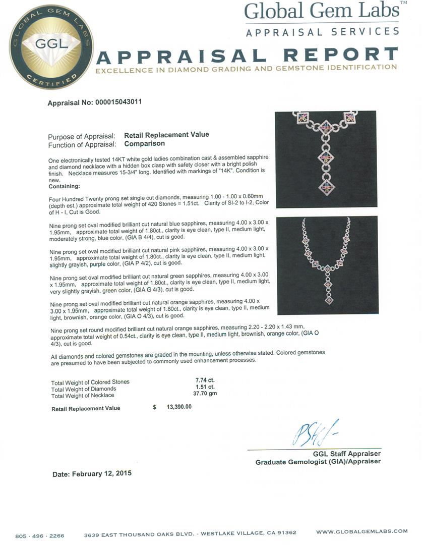 One electronically tested 14KT white gold ladies combination cast & assembled sapphire and diamond necklace with a hidden box clasp with safety closer with a bright polish finish. Necklace measures 15-3/4" long. Identified with markings of "14K". Condition is new. Containing: Four Hundred Twenty prong set single cut diamonds, measuring 1.00 - 1.00 x 0.60mm (depth est.) approximate total weight of 420 Stones = 1.51ct. Clarity: SI-2 to I-2. Color: H - I, Cut is Good. Colored gemstones are presumed to have been subjected to commonly used enhancement processes. All diamonds and colored gemstones are graded in the mounting, unless otherwise stated. Nine prong set oval modified brilliant cut natural blue sapphires, measuring 4.00 x 3.00 x 1.95mm, approximate total weight of 1.80ct., clarity is eye clean, type II, medium light, moderately strong, blue color, (GIA B 4/4), cut is good. Nine prong set oval modified brilliant cut natural pink sapphires, measuring 4.00 x 3.00 x 1.95mm, approximate total weight of 1.80ct., clarity is eye clean, type II, medium light, slightly grayish, purple color, (GIA P 4/2), cut is good. Nine prong set oval modified brilliant cut natural green sapphires, measuring 4.00 x 3.00 x 1.95mm, approximate total weight of 1.80ct., clarity is eye clean, type II, medium light, very slightly grayish, green color, (GIA G 4/3), cut is good. Nine prong set oval modified brilliant cut natural orange sapphires, measuring 4.00 x 3.00 x 1.95mm, approximate total weight of 1.80ct., clarity is eye clean, type II, medium light, brownish, orange color, (GIA O 4/3), cut is good. Nine prong set round modified brilliant cut natural orange sapphires, measuring 2.20 - 2.20 x 1.43 mm, approximate total weight of 0.54ct., clarity is eye clean, type II, medium light, brownish, orange color, (GIA O 4/3), cut is good. All diamonds and colored gemstones are graded in the mounting, unless otherwise stated. Colored gemstones are presumed to have been subjected to commonly used enhancement processes. Total Weight of Colored Stones 7.74ct. Total Weight of Diamonds 1.51ct. Total Weight of Necklace 37.70 grams. GGL Appraised at $13,390.00.