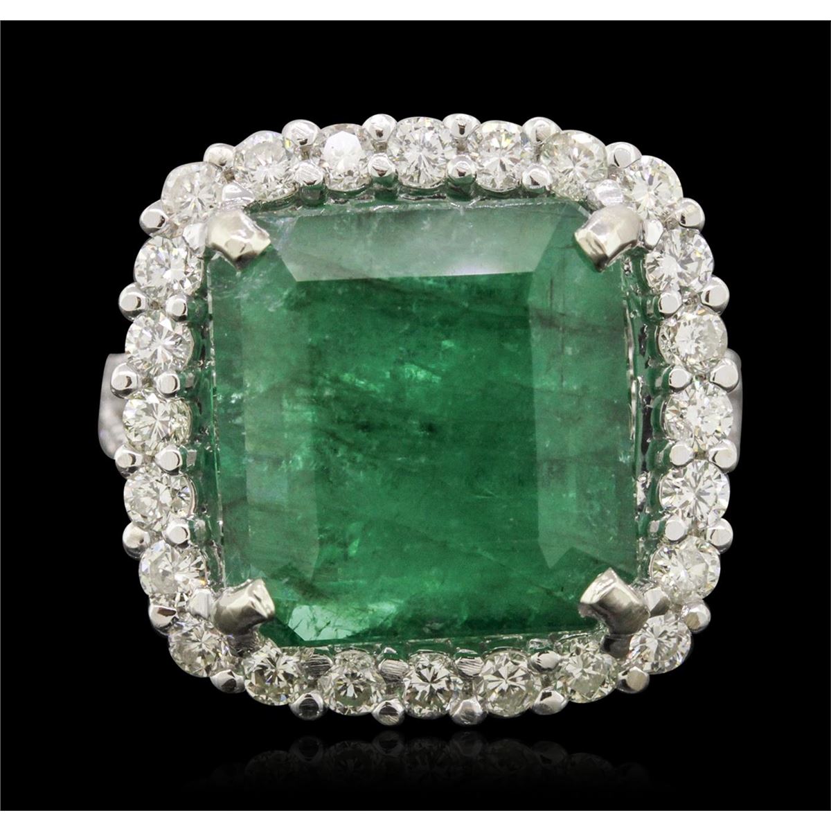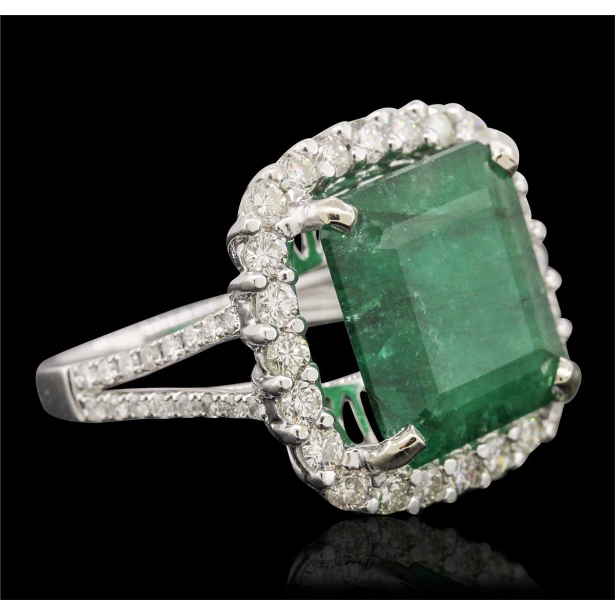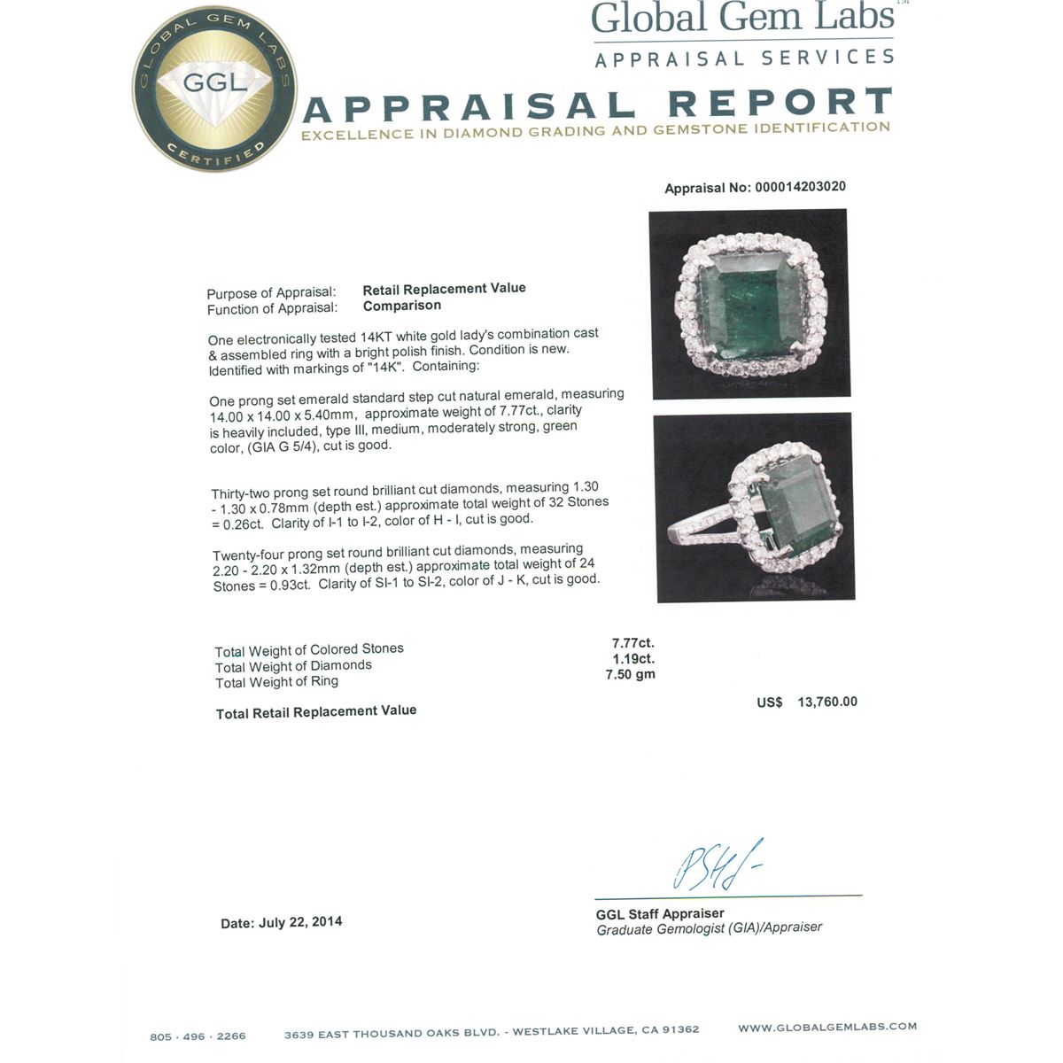 One electronically tested 14KT white gold ladies combination cast & assembled ring with a bright polish finish. Condition is new. Identified with markings of "14K". Containing: One prong set emerald standard step cut natural emerald, measuring 14.00 x 14.00 x 5.40mm, approximate weight of 7.77ct., clarity is heavily included, type III, medium, moderately strong, green color, (GIA G 5/4), cut is good. Thirty-Two prong set round brilliant cut diamonds, measuring 1.30 - 1.30 x 0.78mm (depth est.) approximate total weight of 32 Stones = 0.26ct. Clarity: I-1 to I-2. Color: H - I, Cut is Good. Twenty-Four prong set round brilliant cut diamonds, measuring 2.20 - 2.20 x 1.32mm (depth est.) approximate total weight of 24 Stones = 0.93ct. Clarity: SI-1 to SI-2. Color: J - K, Cut is Good. Total Weight of Colored Stones 7.77ct. Total Weight of Diamonds 1.19ct. Total Weight of Ring 7.50 grams. GGL Appraised at $13,760.00.